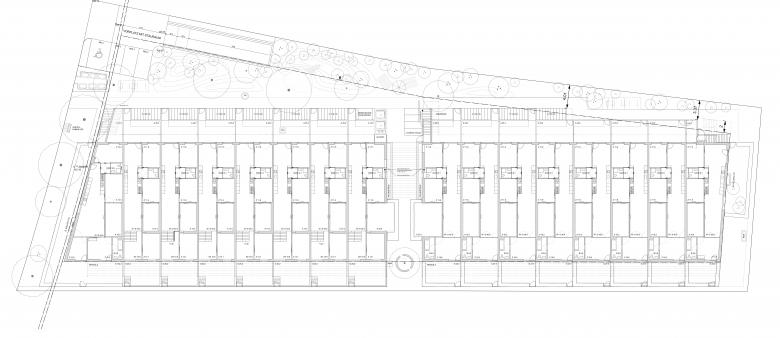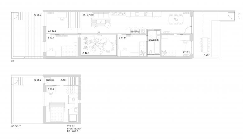 Die beiden Gebäudevolumen nehmen mit ihrem ausgedehnten Footprint von jeweils rund 22 auf 52 Metern Bezug auf die ehemals vorherrschenden Gebäudetypologien der Gewerbehallen. Über dem ausgedehnten Erdgeschoss, welches Wohnungen mit einer Hoftypologie aufnimmt, erheben sich drei weitere Geschoss mit über einen Laubengang erschlossenen Kleinwohnungen im 1. Obergeschoss und darüberliegenden Duplex-Typen, welche ebenfalls durch einen Laubengang im Attika erschlossen sind.
