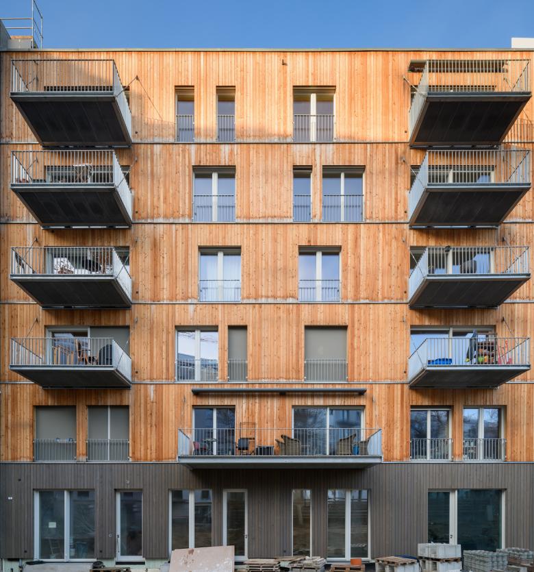 Der Bauherr, die Baugemeinschaft Holzhaus SL GbR, realisiert das ökologische KfW Effizienzhaus 40+ in Hybridbauweise mit 18 Wohneinheiten einschließlich einer Clusterwohnung, einem Jugendtreff und mehreren Gemeinschaftsräumen. Entworfen wurde das 7-geschossige Wohnhaus als Holzbau mit einem Wandaufbau aus Brettsperrholzelementen und einem vorgesetzten Riegelwerk zur Ausbildung der Dämmebene. Die Fassade in Richtung Straße ist mit Faserzementplatten bekleidet, die zum Hof aus Gründen der Haltbarkeit mit unbehandeltem Lärchenholz. Die Geschossdecken bestehen aus Hohlkörper-Holzelementen. Lediglich das Keller- und Erdgeschoss sowie der Erschließungskern, inklusive Treppenläufe und die Brandwände wurden in Stahlbeton umgesetzt. Die Konstruktion der in einer sogenannten Hybridbauweise ausgeführten oberen Etagen setzt sich zusammen aus tragenden Holzmassiv-Fassaden sowie einem Verbund aus Holzstützen und Stahlträgern. Auf diese Weise werden Deckenspannweiten von bis zu sechs Metern und somit nahezu stützenfreie Grundrisse ermöglicht. „Unsere Entscheidung für die Bauweise mit Holz vor über 15 Jahren war eine bewusste und trägt neben dem architektonischen Mehrwert, den Holz bietet, vor allem auch unserer sozialen Verantwortung als Bauschaffende Rechnung. Um nachhaltig zu bauen, bedarf es Bauten, die langlebig, ästhetisch hochwertig und wiederverwertbar sind. Das alles lässt sich mit dem nachwachsenden Baustoff Holz realisieren“, sagt Daniela Galárraga von Scharabi Architekten in Berlin.