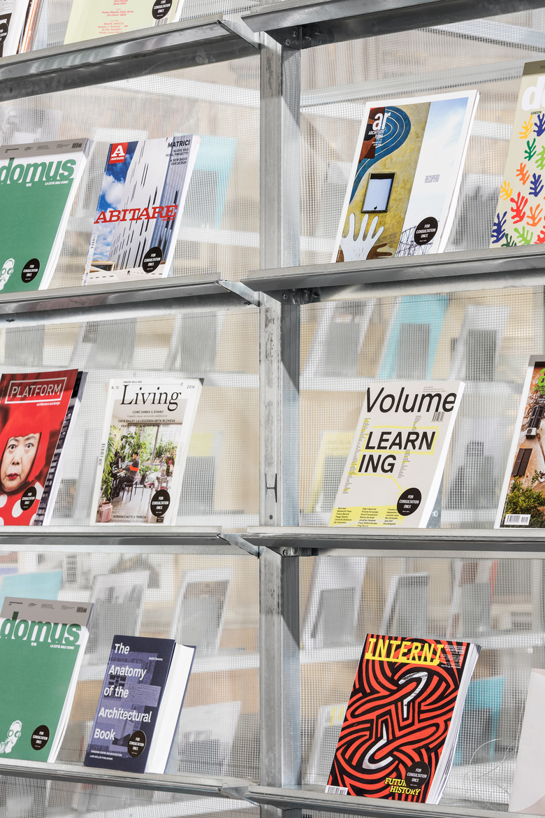 The elements are made of affordable building materials: from the main framework and furnishing, in plasterboard and 50x55x50mm stainless steel C profiles, to shelves and magazine supports, in bent and shaped 40x150x40mm stainless steel U guide profiles.To fill the weave, spatially and metaphorically, magazines and books at the public’s fingertips, bring consistency to the framework.