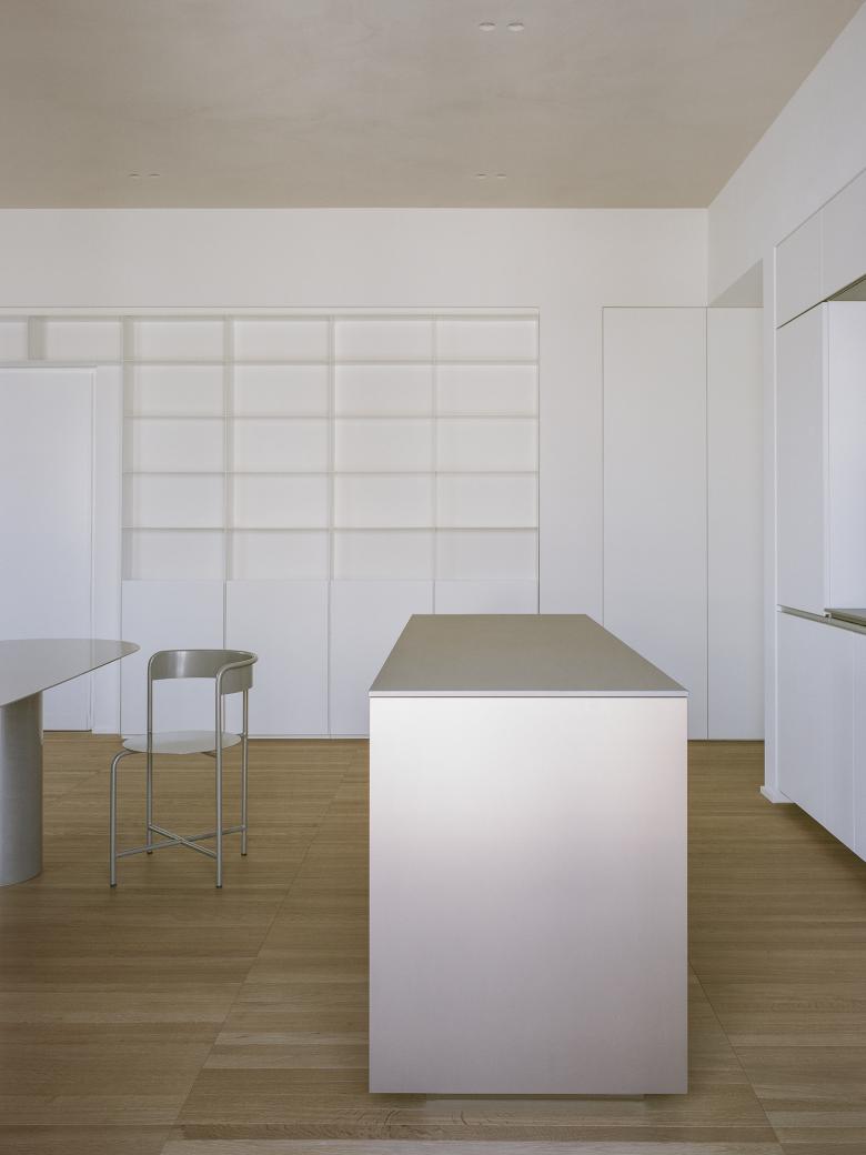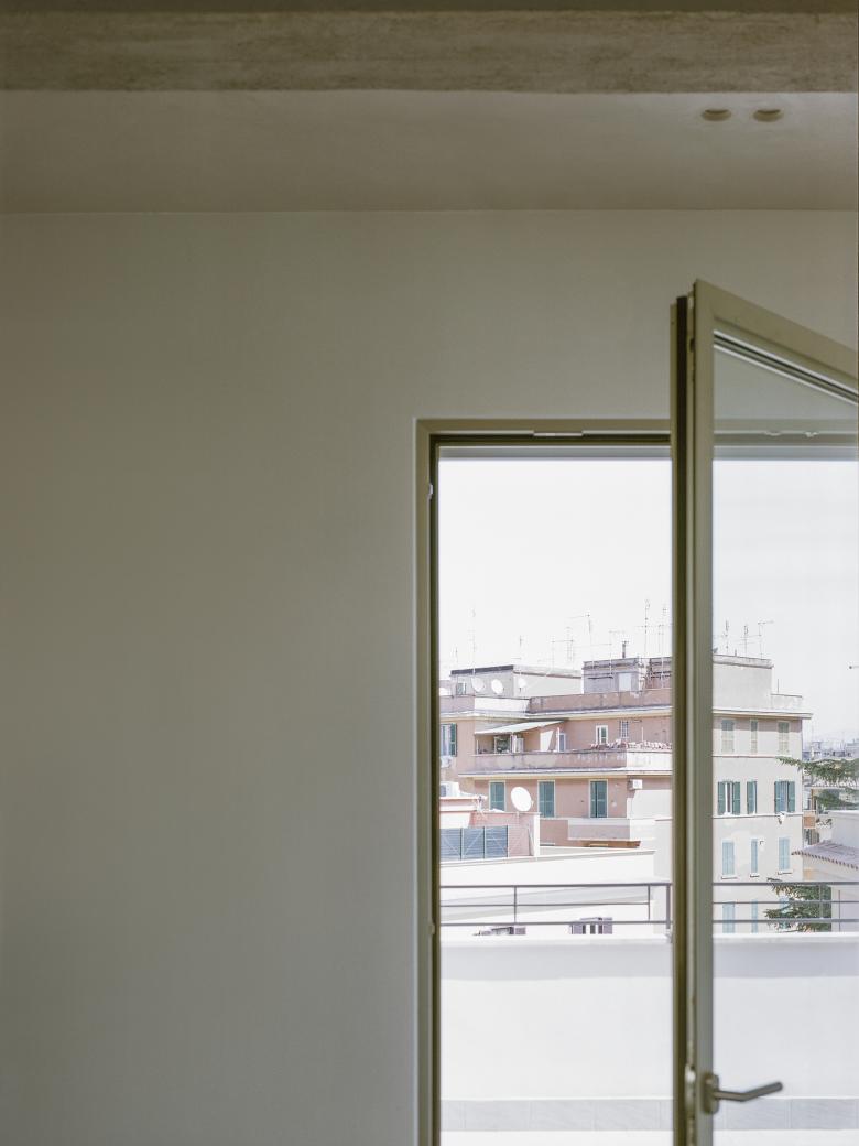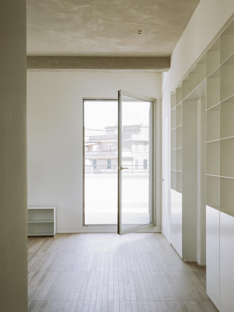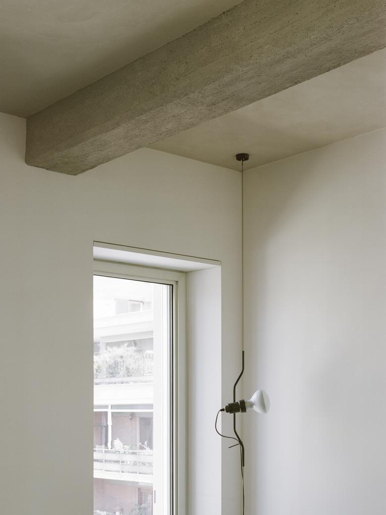 The apartment is located on the top floor of an early twentieth century building located along Via Latina, one of the oldest roadways in Rome. Today the Appio-Latino district has a lively and dynamic soul in which inhabitants from different cultures and social classes live together. The urban layout of the area also presents a complex articulation with a stratigraphy of different periods and styles, from the Roman ruins of the Caffarella Park, to the villas of the early 1900s, up to the spontaneous dwellings of the Borghetto Latino built over the 1930s. The refurbishment project designed for a young owner couple and their child, takes inspiration from the context rich of history in which it is inserted, translating it into a project in which the space is laid bare and enters into a relationship with the light of the city, thought as a common thread between past and present. The architectural space is essential and highlights the chosen materials: wood, metal and rough plasters. The materiality therefore plays a fundamental role in order to offer the inhabitants of the house a tactile experience with the environment and give a sense of serenity deriving from the warmth of natural materials. For the floor, a natural oak parquet with parallel laying was chosen, which determines a geometric order in contrast with the naturalness and imperfections of the wood. The walls are neutral, white in contrast to the materiality of the ceiling, treated with a gray natural lime-based finish that creates a chromatic link with the concrete beam. The metal furnitures were designed specifically for the apartment. The choice of metal is symbolic as well as aesthetic, and can be read as a desire to rethink in a contemporary key, a material widely used in Roman times for the production of everyday objects. Even the geometries of the bespoke furnitures take up the archetypal and universal forms such as the circle, to underline the desire to recreate a timeless domestic environment, in continuity with the morphology of the building and the historical events of its neighborhood.
