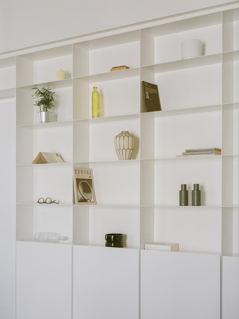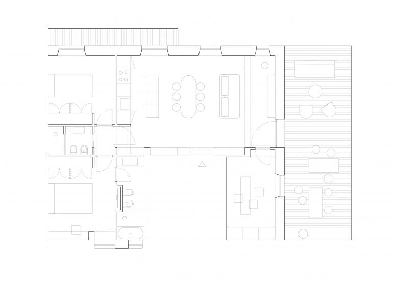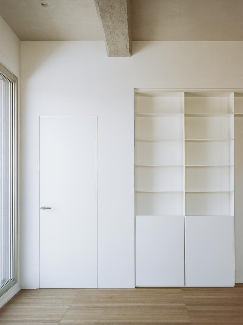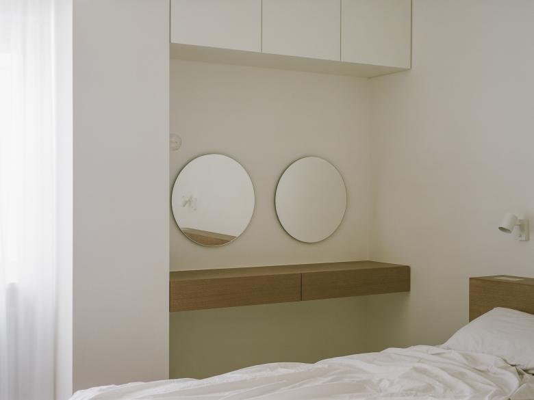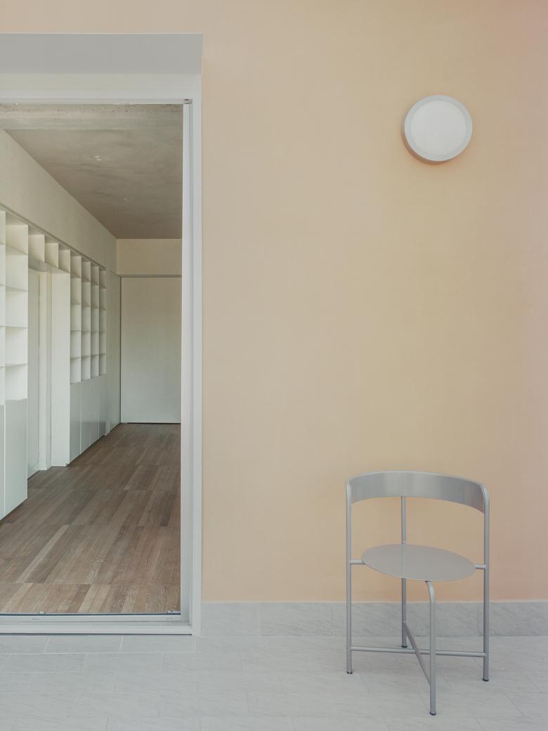 The apartment is located on the top floor of an early twentieth century building located along Via Latina, one of the oldest roadways in Rome. Today the Appio-Latino district has a lively and dynamic soul in which inhabitants from different cultures and social classes live together. The urban layout of the area also presents a complex articulation with a stratigraphy of different periods and styles, from the Roman ruins of the Caffarella Park, to the villas of the early 1900s, up to the spontaneous dwellings of the Borghetto Latino built over the 1930s. The refurbishment project designed for a young owner couple and their child, takes inspiration from the context rich of history in which it is inserted, translating it into a project in which the space is laid bare and enters into a relationship with the light of the city, thought as a common thread between past and present. The architectural space is essential and highlights the chosen materials: wood, metal and rough plasters. The materiality therefore plays a fundamental role in order to offer the inhabitants of the house a tactile experience with the environment and give a sense of serenity deriving from the warmth of natural materials. For the floor, a natural oak parquet with parallel laying was chosen, which determines a geometric order in contrast with the naturalness and imperfections of the wood. The walls are neutral, white in contrast to the materiality of the ceiling, treated with a gray natural lime-based finish that creates a chromatic link with the concrete beam. The metal furnitures were designed specifically for the apartment. The choice of metal is symbolic as well as aesthetic, and can be read as a desire to rethink in a contemporary key, a material widely used in Roman times for the production of everyday objects. Even the geometries of the bespoke furnitures take up the archetypal and universal forms such as the circle, to underline the desire to recreate a timeless domestic environment, in continuity with the morphology of the building and the historical events of its neighborhood.