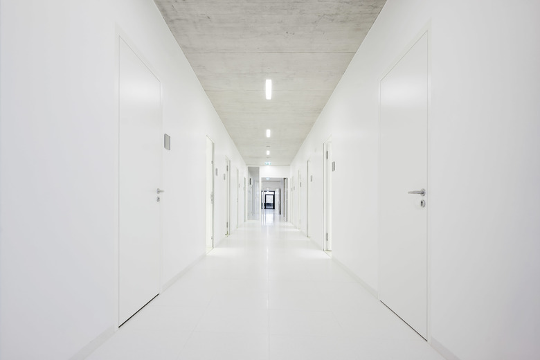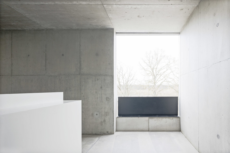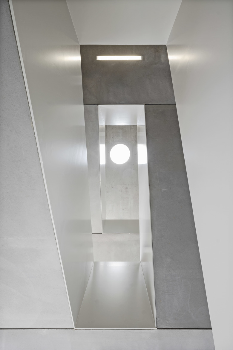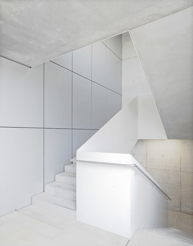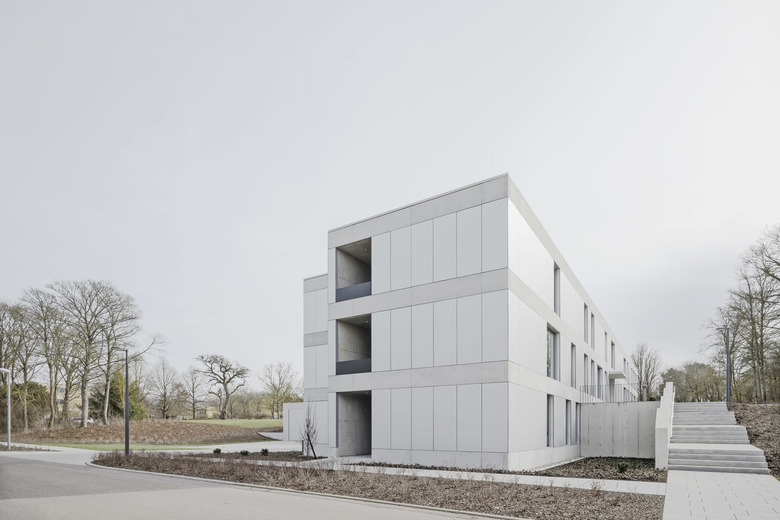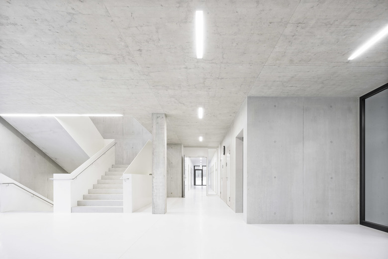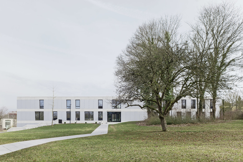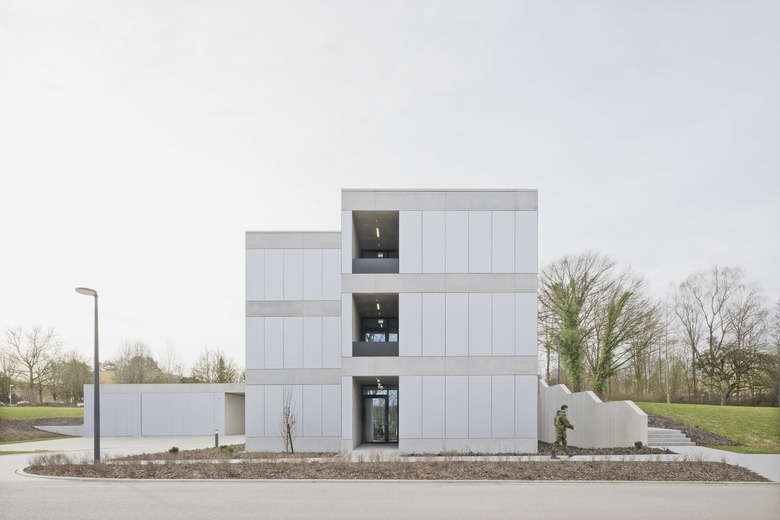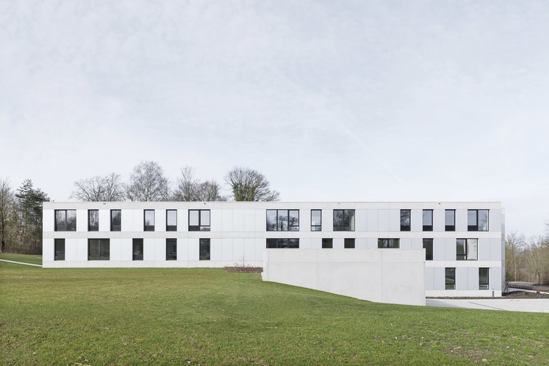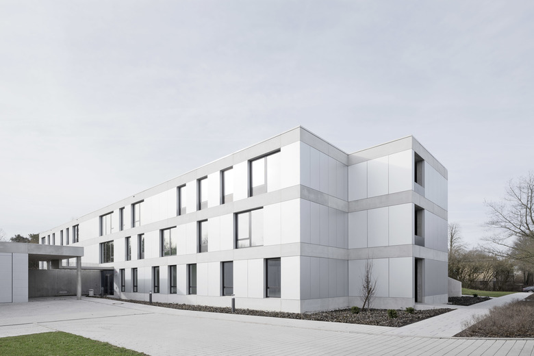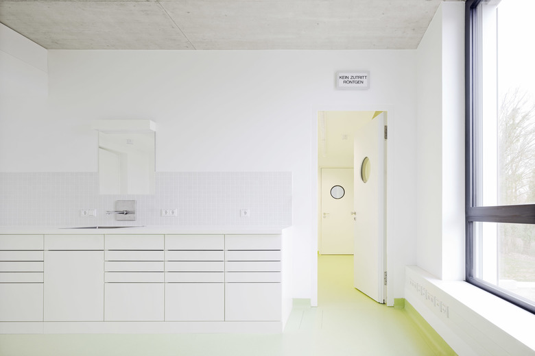 Das äußere Erscheinungsbild wird geprägt durch drei bzw. vier ca. 75cm breite, horizontal verlaufende Sichtbeton-Fertigteilbänder in den Deckenstirnbereichen, die die im Raster vertikal angeordneten, matt schimmernden Alucobondplatten jeweils oben und unten fassen. Fenster mit dunklen Aluminiumprofilen sind – ähnlich eines Codes - als große Lochfenster, teilweise übereinanderliegend, teilweise gegen- einander versetzt, im Rastermaß der Fassadenplatten vertieft einge- setzt. Der Innenraum in Fluren und Erschließungsbereichen wird von folgenden Elementen dominiert: dem nahezu weißen Kunststeinbelag, den hellen Wänden mit flächenbündig eingelassenen Türen sowie von Sichtbetondecken, in die die schlichten Leuchten ebenso flächenbündig integriert sind. In den Behandlungs- und Diensträumen kommt am Boden durch den grünlichen Kautschuk Farbe ins Spiel.