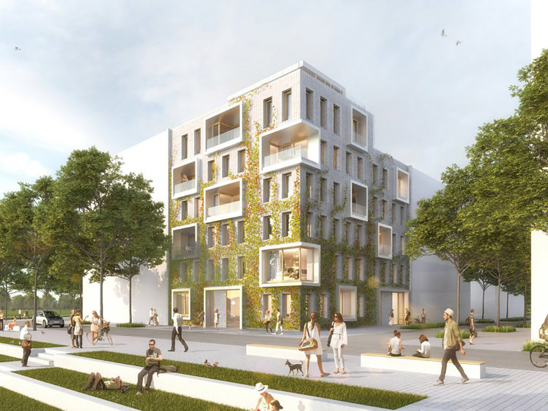 Im Zuge der Stadtentwicklungsstrategien Heilbronn wird es auf dem Gelände der BUGA 2019 eine bewohnte und lebendige Stadtaustellung geben. Ein über hundert Jahre altes Gewerbegebiet wird hierzu in ein vitales Stadtquartier verwandelt, dass aufzeigen soll wie künftig am Neckarbogen gewohnt werden kann. Im Rahmen dieser ungewöhnlichen städtebaulichen Entwicklung entsteht eine architektonische Modellbebauung, die die zukünftigen Wohn-, Arbeits- und Versorgungsstrukturen aufzeigen sollen. Das Wohn- und Geschäftshaus Grüne Ecke ist Puzzleteil der neu geplanten Bebauung auf Baufeld H. Im Rahmen der Modellausstellung wird hier mit dem innovativen Baumaterial Infraleichtbeton, der sich durch seine besondere Dämmeigenschaft ausweist, ein Pioniergebäude der Architekten Mattes Riglewski entstehen. Gegenüber dem neugeplanten Stadtsee, eingebettet in die grüne Landschaft der umliegenden Gärten, wächst das Grün vertikal an der Fassade über die Landschaft hinaus und sorgt im Zusammenspiel mit dem Infraleichtbeton für eine angenehme Wohn- und Arbeitsatmosphäre.