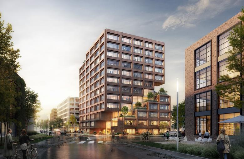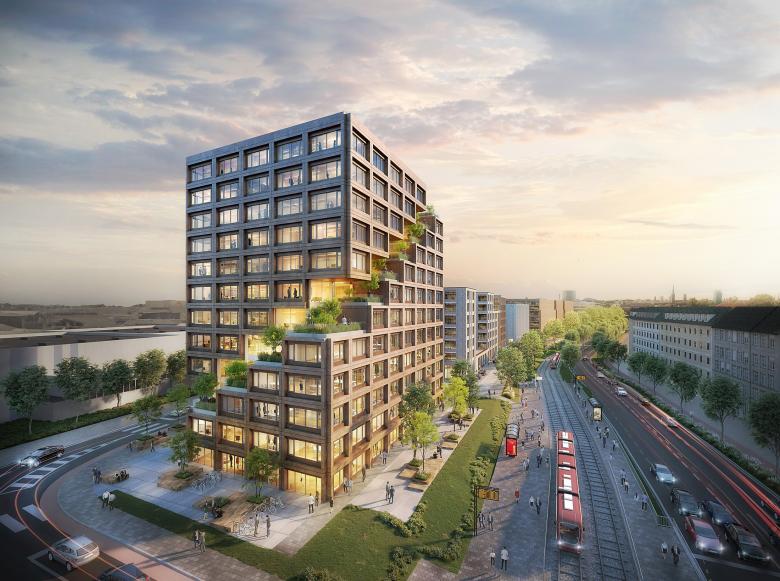 Mit zwölf Geschossen wird es das höchste Gebäude des mehr als sechs Hektar umfassenden Areals und soll eine identitätsstiftende Landmarke für das gesamte Quartier bilden.