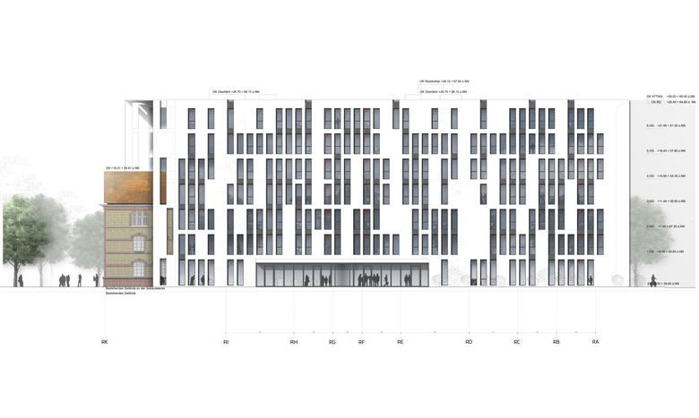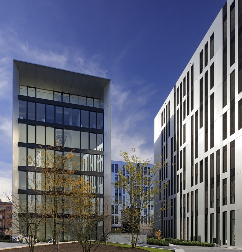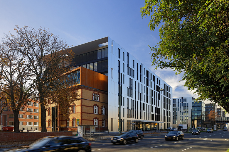 On a corner plot of the former Uhlan barracks in the Derendorf district of Dusseldorf stands the building ensemble Clara & Robert, by sop architekten, which links the two new buildings with the historical Saarhaus. The Wilhelmine barracks, erected in 1890 and currently among the largest remaining barracks facilities in the Rhineland, were given new life through comprehensive renovation and expansion. The Clara & Robert office complex builds on the location’s architectural history, while the preservation of the expressive Saarhaus, which is being integrated into one of the new buildings, restores the link to the former barracks. The name and inspiration for the two angular, interlocking, L-shaped buildings, which boast around 16,800 m2 of rentable space, were the composer couple Clara and Robert Schumann, who lived in Dusseldorf in the middle of the 19th century. The vertical slits in the polished natural aluminium building envelope recall old perforated-metal music discs used to record sound for mechanical musical instruments around the beginning of the last century. The material’s matte shine lends the façade a discreet reflective quality, allowing the changing light conditions to project a myriad of different moods onto the building. The largely visible yellow-brick façade of the historical Saarhaus is framed by the protruding shell of one of the new buildings. A monolithic Corten steel box, the colour of which samples the old brick, contrasts while expanding the old building by two storeys, thereby establishing architectural relationship with the new complex. The resulting flat-roof construction offers space for attractive rooftop terraces. The main entrance areas are fronted with an expansive glass façade. All window installations are furnished sun-screening systems. Both 7-storey office buildings possess a flexible floor-plan structure, which guarantees the integration of variously sized rental units. The office space is variably divisible on all floors, and can accommodate all conceivable types of tenants, from individual and group offices to combined-use zones and open spaces. The underground levels, which link the two buildings to one another, are used for technical facilities, storage and a car park with around 300 parking spots. The grounds around the building have been intensively planted and provide space for fully paved access routes and generous driveways. The property’s existing trees that were able to remain were integrated into green islands, emphasising the history of the location. Location Dusseldorf Derendorf Developer die developer Projektentwicklung GmbH Team Jurek M. Slapa, Jürgen Kowald, Daniel Kohlmeyer, Frank Ostrowski, Irene Lening.
