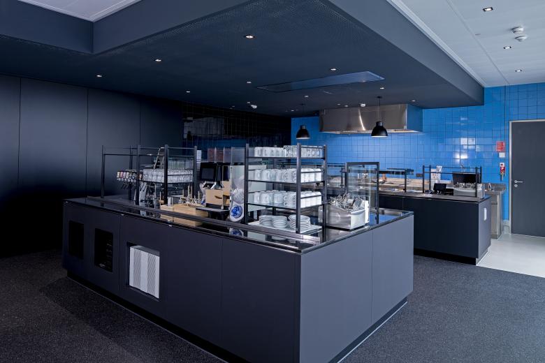 Inmitten des zurückgenommenen Interieurs sorgen nicht nur die azurblauen Hochglanzfliesen im Bistro für einen kräftigen Farbakzent. Eine regelrechte Bühne wird der rund elf Meter hohen Farb-Installation im zentralen Atrium des Gebäudes bereitet, die sop architekten in Kooperation mit dem Künstler Heinz Mack realisiert hat.