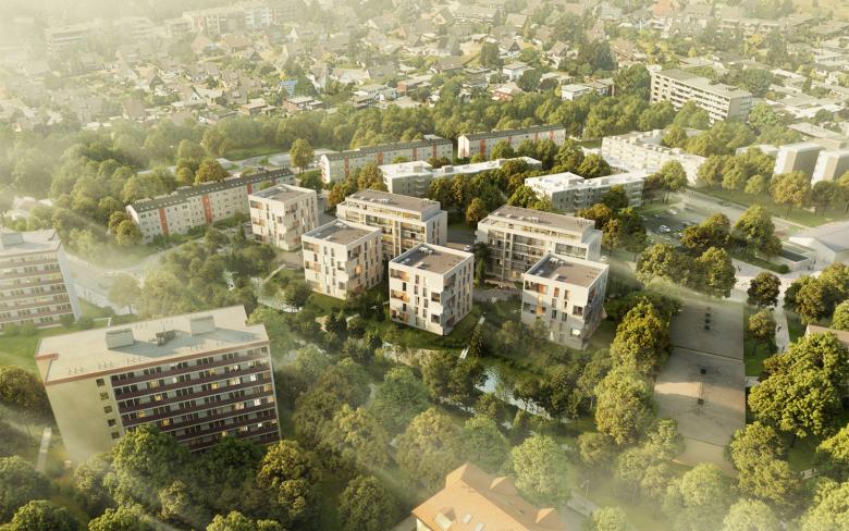 Mit der aufgelockerten, von Grün umflossenen Zeilen- und Punktbebauung wird die städte-bauliche Struktur der umliegenden „50er-Jahre-Stadt“ aufgegriffen und eine angemessene, räumliche Kontinuität geschaffen. Zwei scheibenartige Gebäude bilden den Rücken des neuen Wohnquartiers, vor denen sich vier locker angeordnete Punkthäuser verteilen. So entstehen unterschiedlichste Sichtachsen und variierende Wegebeziehungen im Zusammenspiel mit einer identifikationsstiftenden Außenraumgestaltung.