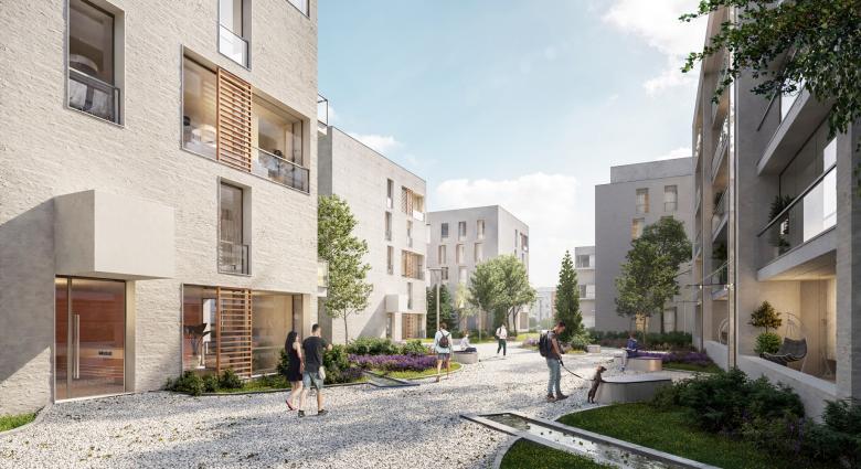 Um den parkähnlichen Charakter des Quartiers hervorzuheben, wird bewusst auf einen zentralen Platz verzichtet. Stattdessen bietet eine abwechslungsreiche Durchwegung eine hohe Aufenthaltsqualität durch zum Verweilen einladende Aufweitungen und schmalere Übergänge. Dies schafft vielfältige Möglichkeiten zum gemeinschaftlichen Zusammenleben und zur Interaktion unter den Bewohnern.