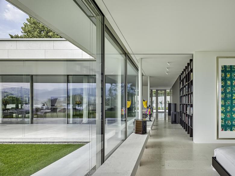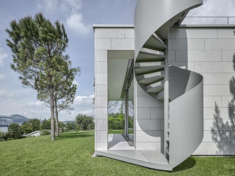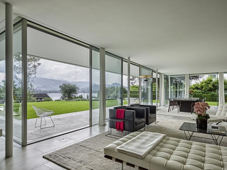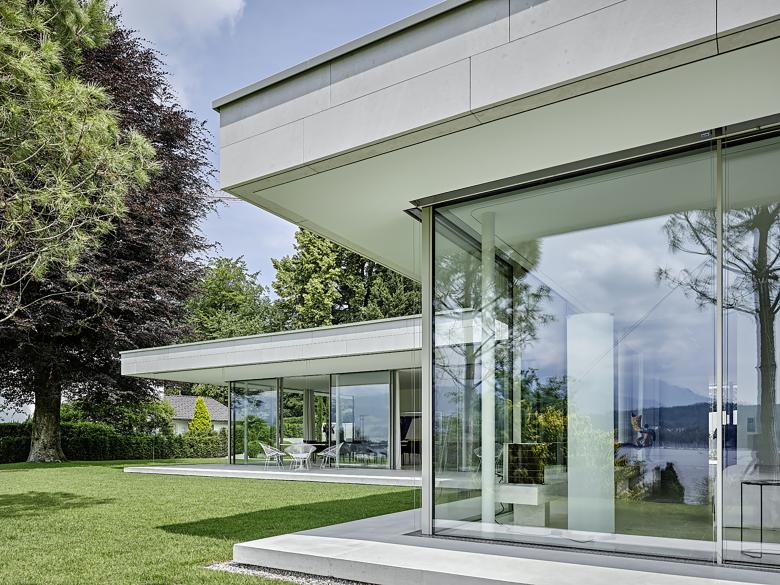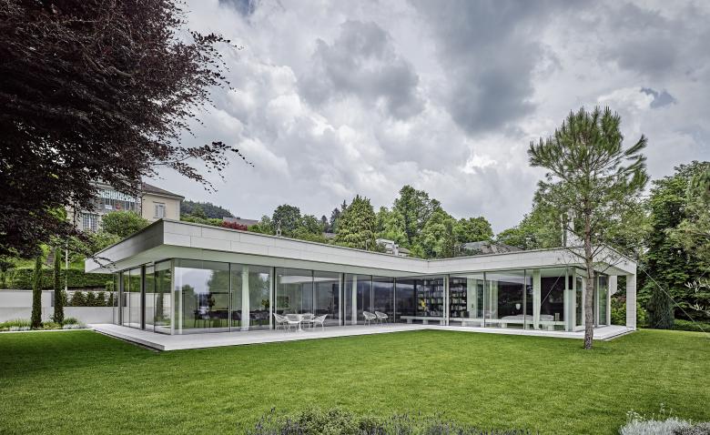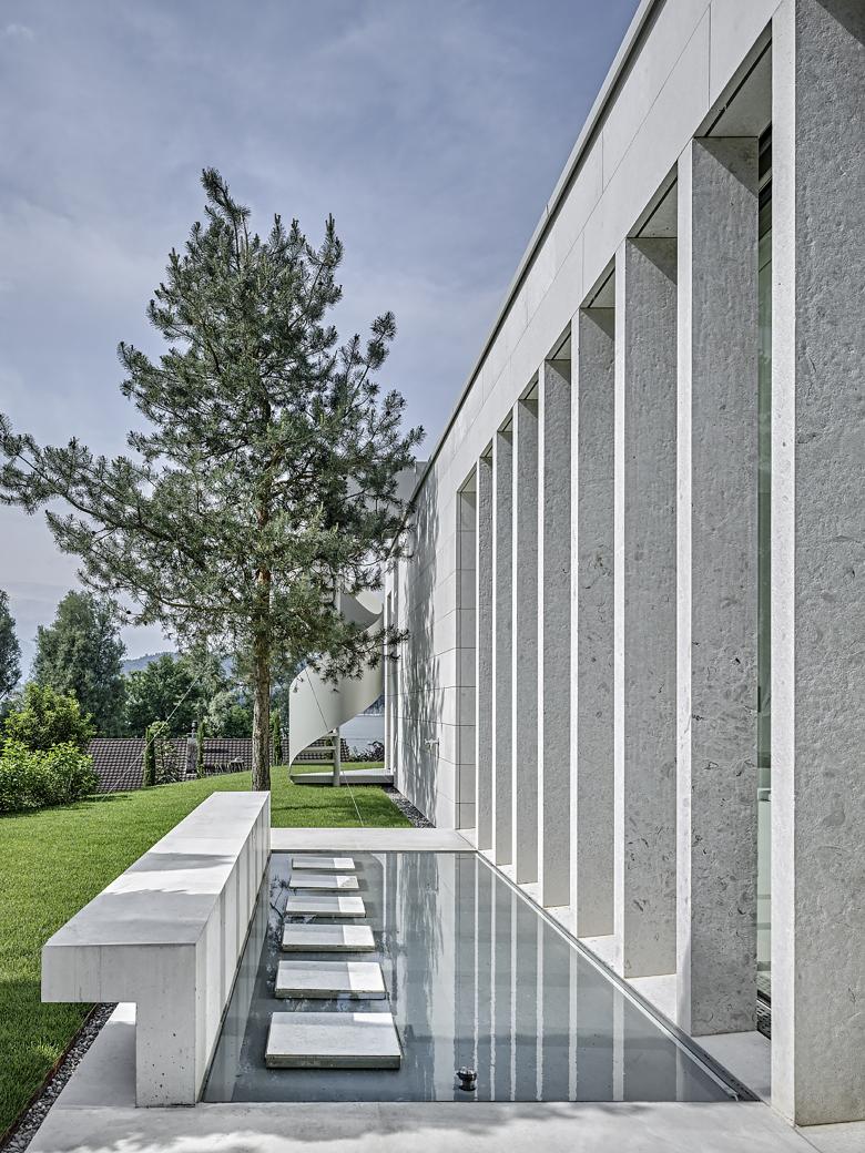 Der Neubau an der Leumattstrasse liegt im Bellerive-Quartier, nahe zum Stadtzentrum von Luzern. Das Grundstück in leicht erhöhter Lage, am Fusse des Villenquartiers, bietet einen fantastischen und einmaligen Ausblick auf den Vierwaldstättersee, die Innerschweizer Alpen mit dem Hausberg Pilatus und der Stadt Luzern. Das eingeschossige Winkelhaus mit der freistehenden Doppelgarage ist über den nordseitigen Hof erschlossen, welcher hangseitig durch helle Sichtbetonwände gefasst wird. Die Trennung in den Tag- und Nachtbereich erfolgt klassisch über die beiden Gebäudeschenkel. Als Gelenk dient die grosszügige und lichtdurchflutete Eingangshalle, mit dem offenen Abgang ins Untergeschoss. Der Wohnraum mit der Breitseite gegen Süden eröffnet den Weitblick in die Ferne, rückwärtig angebunden ist die kompakte Küche. Der Schlaftrakt mit den Nasszellen fasst einseitig den Aussenraum und bildet gleichzeitig das Rückgrat der Anlage. Die geschlossenen Wandelemente, verkleidet mit Naturstein, verankern den grosszügig verglasten Kubus, welcher mit den vorgelagerten hellen Betonplatten leicht über dem Terrain schwebt. Vertikale Natursteinstelen, verwendet als Filterschicht, rhythmisieren die stringente Fassade. Mit dem stützenfreien und weit ausladenden Vordach erfährt der Wohnraum eine räumlich attraktive Erweiterung. Filigrane Stützen tragen das massive Hauptdach und lassen die Räume fliessen. Mit der reduzierten Materialwahl, der durchgängige Bodenbelag ist aus demselben Naturstein wie die Fassade, der klaren Formensprache und der präzisen Raumfassung, entstand eine qualitätsvolle und grosszügige Wohnatmosphäre. Unterschiedliche und artenreiche Bepflanzungen kontrastieren mit der bestehenden Blutbuche im Westen und zonieren die Gartenanlage. Der befestigte Sitzplatz im Südwesten bietet zusammen mit der Dachterrasse, erreichbar über die elegant geschwungene Wendeltreppe, abwechslungsreiche und attraktive Aufenthaltsbereiche im Aussenraum.