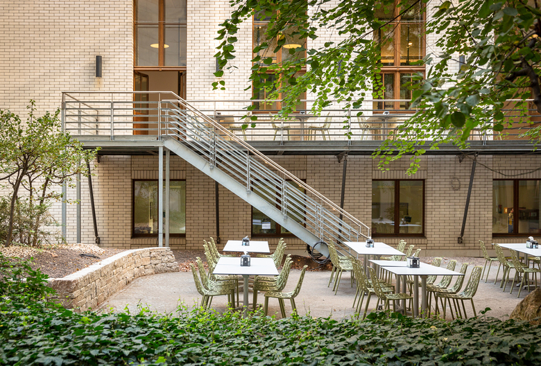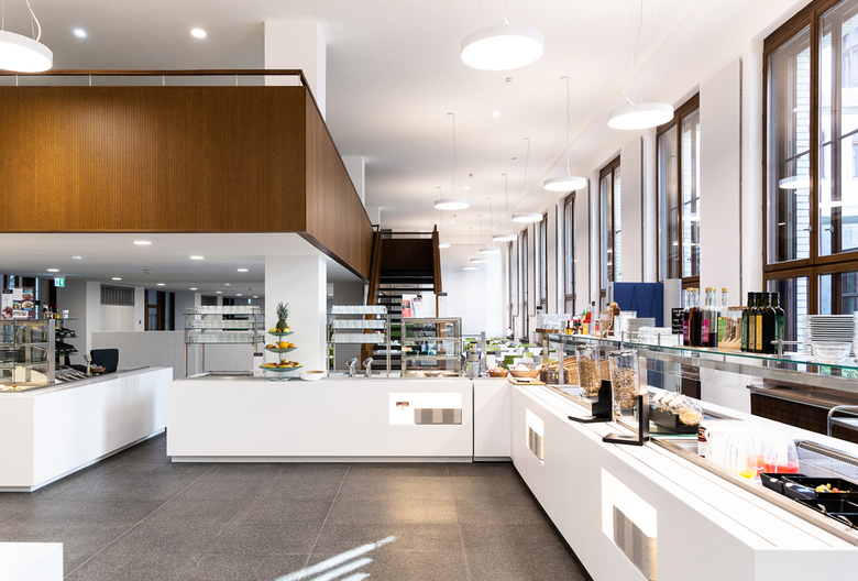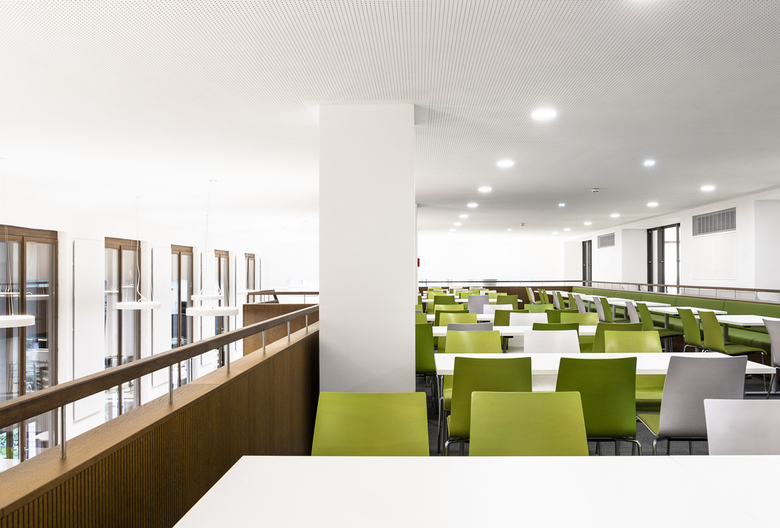 A newly created glazed view into the vestibule and the courtyard brings even more daylight into the canteen. The new design of the previously unused courtyard invites you through a new staircase for lunch in the sunshine.