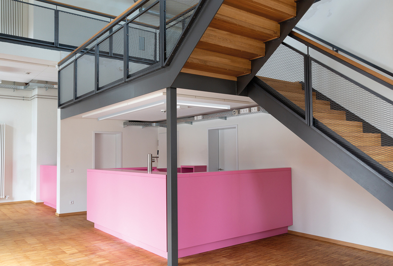 The inner development system has been rearranged according to the types of use. Each use has received a separate access. The two existing staircases between ground and first floor could be maintained. The basement received a new interior access. An emphasis was given to the detailed restoration of the staircases. A modern color concept creates accents in the historic interior.