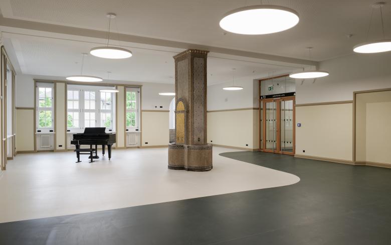 In the middle of the wings of the building, there is a foyer on each floor in connection with the open, representative main staircase, which provides a glimpse into the historical time window of the year 1910. Even from the time the high school was built, sophisticatedly designed fountains adorn the recreation areas. Lavishly restored, the gems shine in new splendour. The cafeteria was housed in the bay window on the ground floor. The previously inconspicuous room could be revitalized in this way. With the restoration of the assembly hall, reconstruction of the Rabitz ceiling and all fixtures, the former Lyceum, the once higher girls' school of Empress Augusta, will regain its spacious festival room. The gym, integrated in the basement of the historic school, was renovated and modernized.