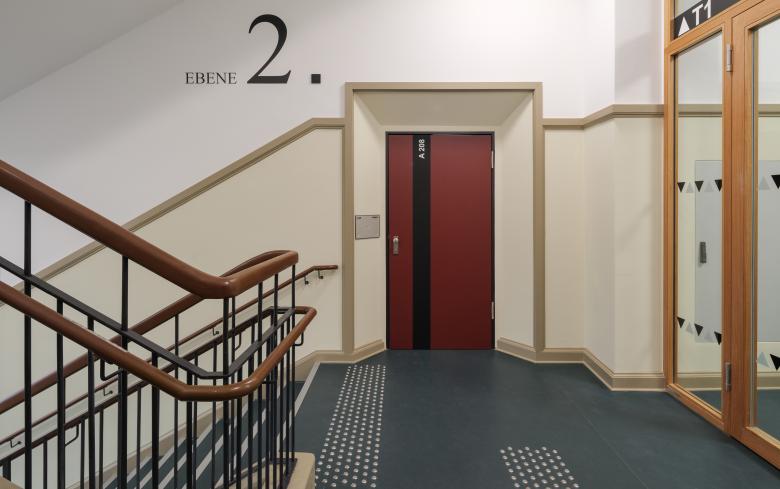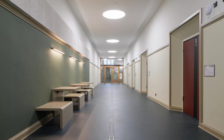 The high school in Berlin-Steglitz is the first listed building with a comprehensive rehabilitation as part of the Berlin school construction offensive (Berliner Schulbauoffensive) in order to meet the demands of a modern school. Special emphasis was placed on inclusion and accessibility, with a focus on "vision". The school should be open to all students, regardless of their individual needs and abilities. The implementation of a corresponding interior concept, in accordance with barrier-free construction (DIN 18040-1), required special attention and was brought into harmony with the design in the historic context.