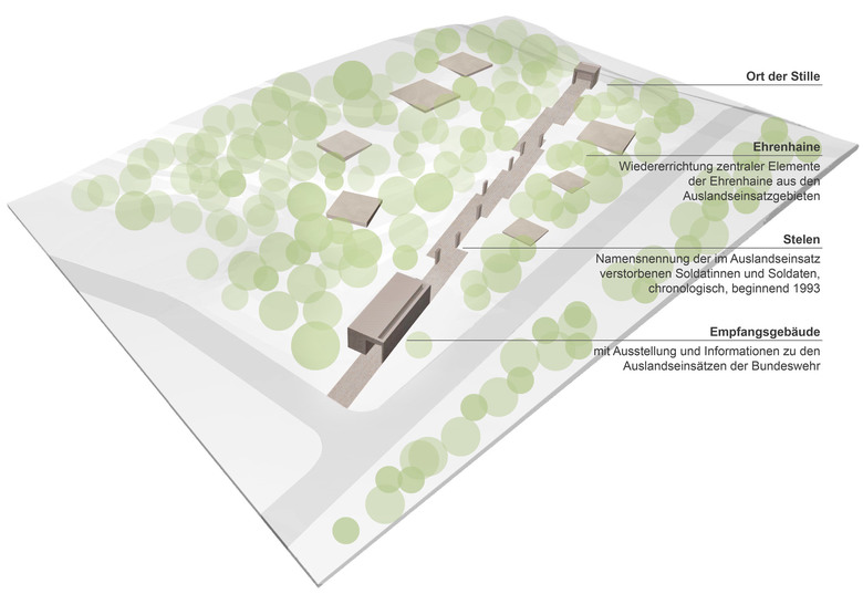 A key influence in the design was the client desire of a place for the personal grief of the bereaved next to the selected location in a heavily forested area. In addition, the honor groves should be recognizable in the Memorial.
