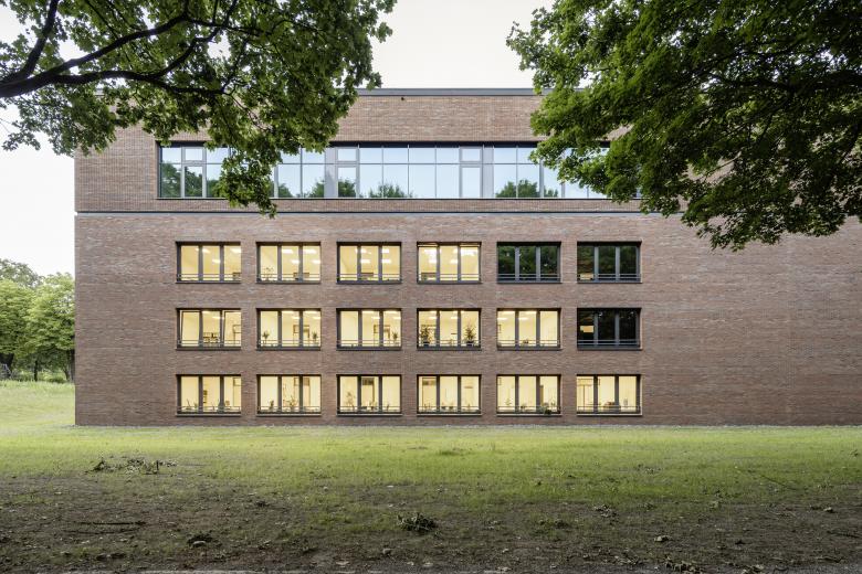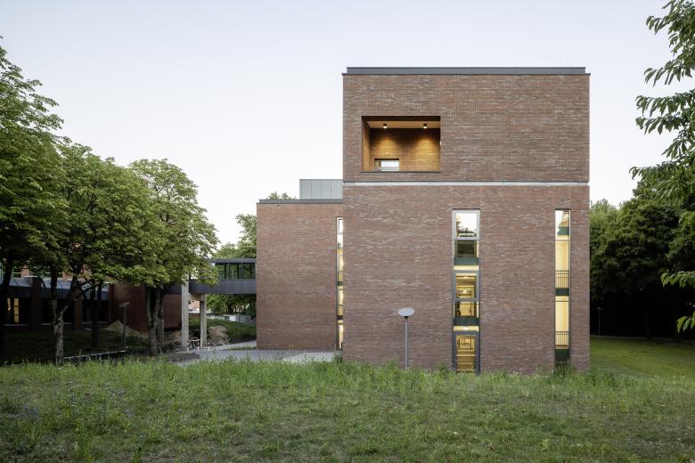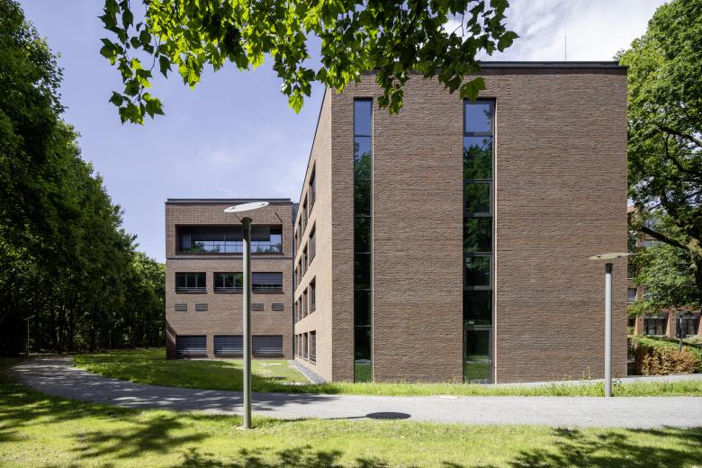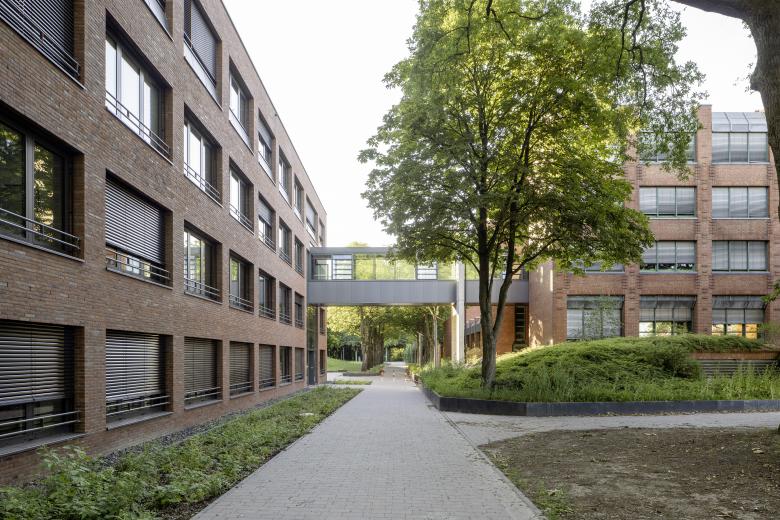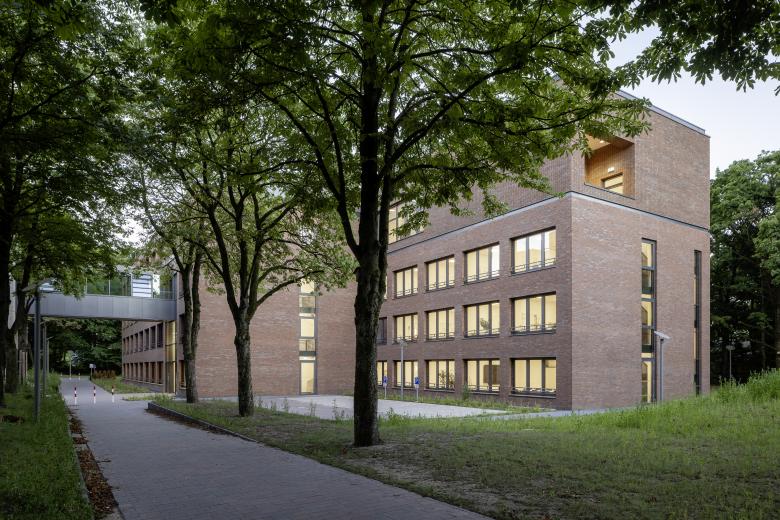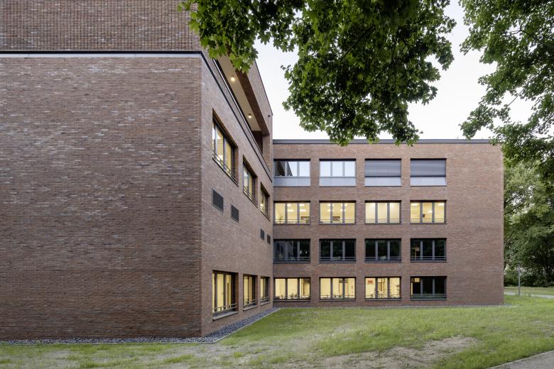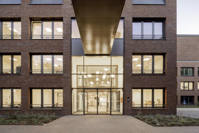 The administration building is realized via the two offset building blocks, which feature a perforated clinker brick façade with the largest possible, inviting window formats. An exciting contrast is achieved through the juxtaposition of maximally open façade surfaces and calm-looking clinker brick surfaces. The stairwells are accentuated by vertical window bands.