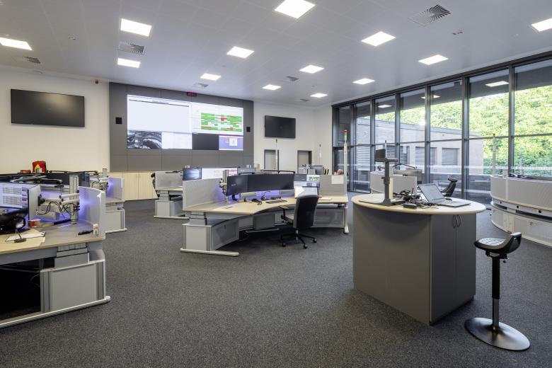 The building grid allows both small room units, such as the rest rooms and offices, and the large room units, such as the control centre, to be organized economically.