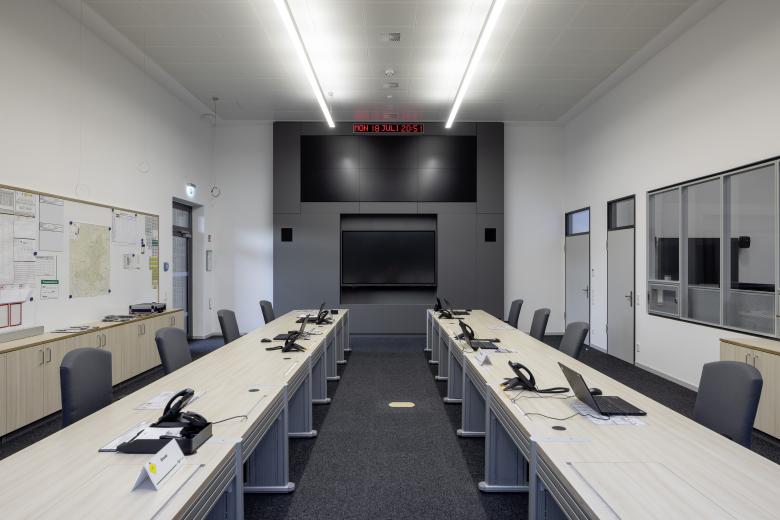 The design envisages a purely administrative building, with the district control center and the necessary ancillary rooms such as a crisis room, overflow areas, rest rooms, etc. located on the top floor as a special use.