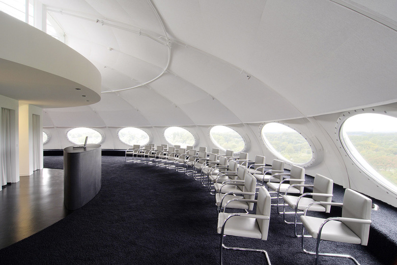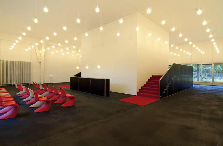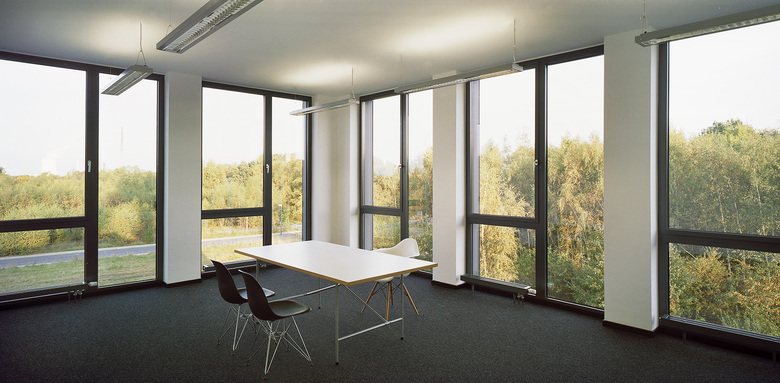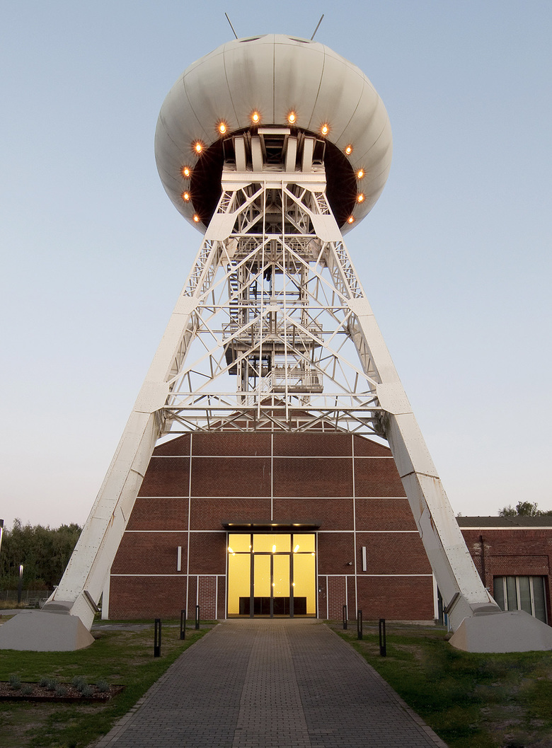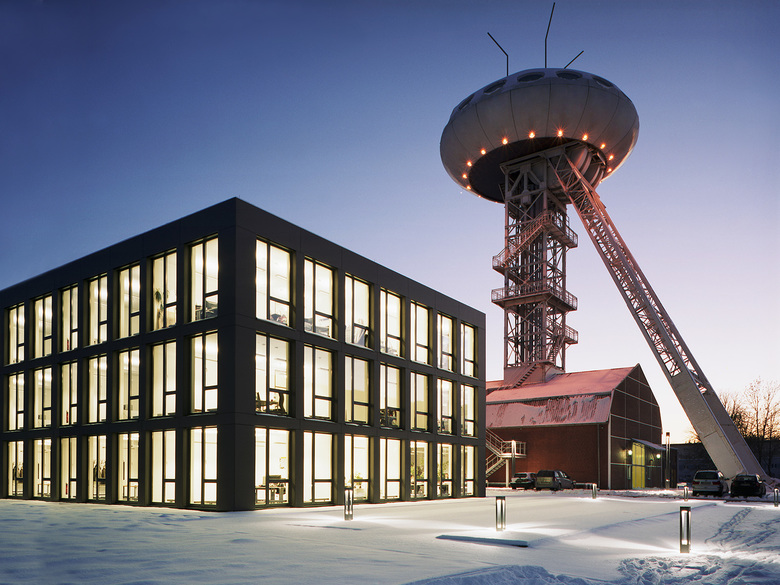In the technology centre of Lünen, over a former coal mine factory, hovers a "UFO". Designed in 1985 by Luigi Colani the “UFO” has become a well known Landmark to the area. The technology and foundation centre and the Academy of Applied Science have accommodated the redundant mining shaft building and “UFO” since 2001. In 2007 LÜNTEC GmbH, the owner and operator, initiated a competition to the refurbishment and extension of office space in this complex. The main idea of the competition was to integrate the "UFO", the shaft and the underlying building into a multifunctional complex able to cater for a wide variety of venues. The main requirement was to preserve the industrial charm of the shaft hall through minimal constructive interventions and once achieved now serves as a prelude for the "UFO". The complex will now play host to future exhibitions and events, including conferences and industrial venues. The UFO, once a lost entity held at distance from the centre of engagement now crowns the complex and offers space for a Business lounge. The restored 37m high Landmark allows an imposing 360 ° panorama view to the visitor. The creative atmosphere inside is supported through controlled lighting and high quality textures and materials. Because the technology centre is marked by its contrasting landscape coupled with the existence of the UFO, it was a necessity to incorporate the Shaft Building into the complete ensemble but still define it as an independent. The design of the new building extension forms in comparison to the heterogeneous existing buildings a quiet counter pole. Particularly the earthy black colour or the clear cubistic façade, force the necessary tension needed between existing and contemporary. The dark monolithic facade stands in contrast to the generous, room-high apertures which bring transparency and ease in the building volume. The Integration of all necessary installations in the core of the building generates the impression of clear space with uniform office surfaces and a maximum in flexibility. With the implementation of integral planning it was possible at the design stage to involve all engineers and consultants required to optimise the design process and ensure the successful communication between developer and planner thus satisfying all objectives. A Special Mention on the German facade award and the Titel “Artwork of the year” impressively verifies the innovative integrated design concept of the Building.