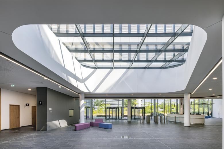 The building is accessed via a two-storey entrance area, which opens up the foyer with access to the central staircase, the conference area and the canteen.