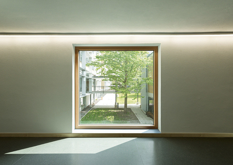 All windows were replaced, through the use of compound windows (wood inside – aluminum outside) the slim profile appearance was compound preserved. Although not required due the conservation, an internal thermal insulation was installed. The thermal insulation reaches the requirements of the EnEV 2009. In addition, the ventilation system of the office and laboratories (S1 and S2) was equipped with a highly efficient heat recovery system. The building is heated by a gas condensing boiler.