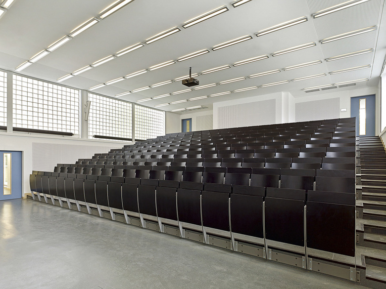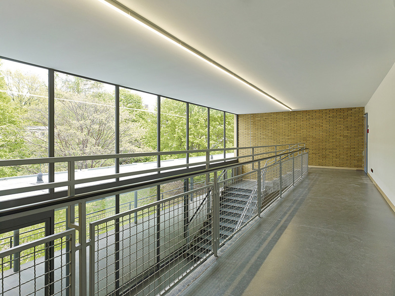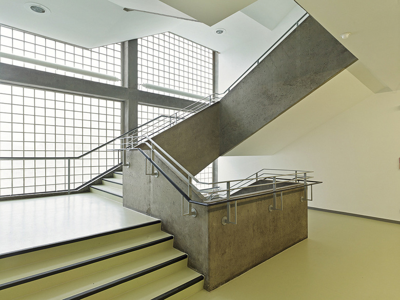In the staircase and the lecture hall original glass blocks have been preserved. New radiators blend in with the historic exterior. The external east staircase no longer satisfied current requirements for lateral impact loads and was retained through the installation of steel braces.