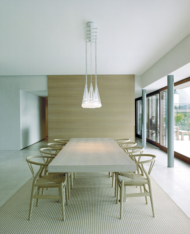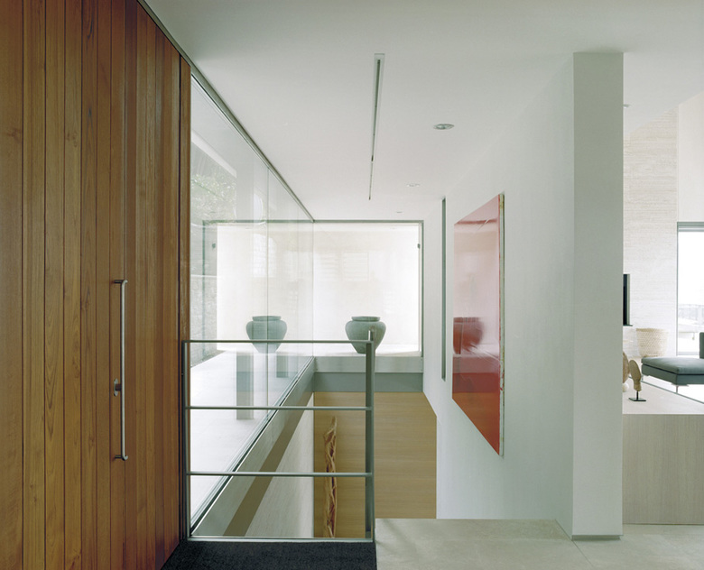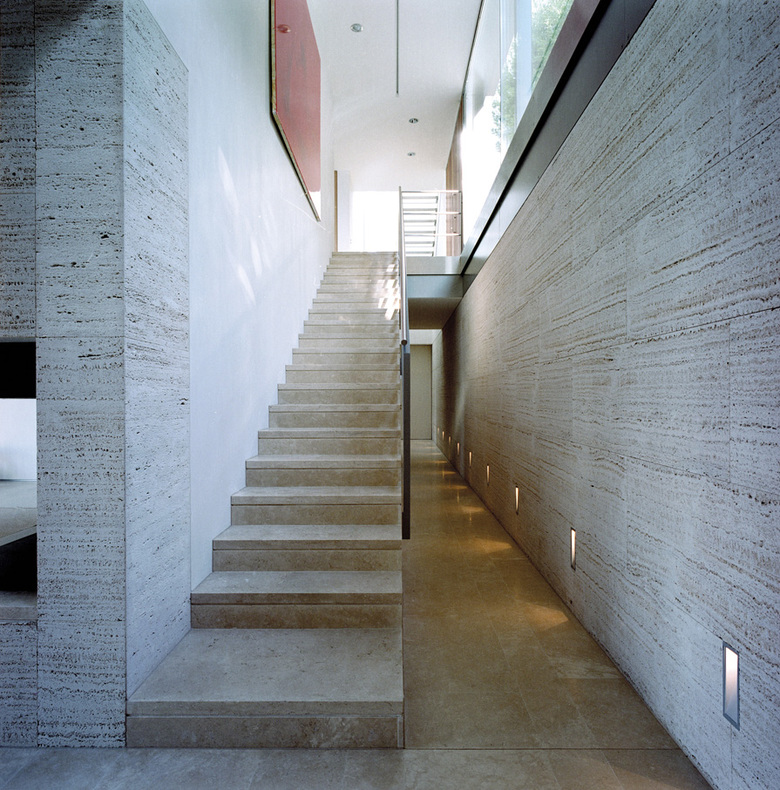 The house is essentially set into the mountain, with terraces extending inside the house to overlap internal and external space. Views were controlled with wider ‘framed’ openings in communal areas and smaller openings in more intimate rooms.A sliding half panel between the kitchen and double-height living room allows for sociable dining or to screen food preparation. Traditional materials- travertino stone, white oak and teak weather and acquire a patina over time, allowing the house to blend into the landscape.