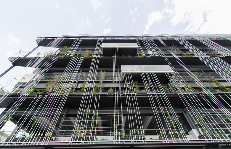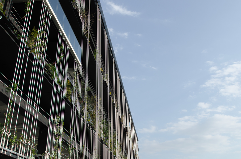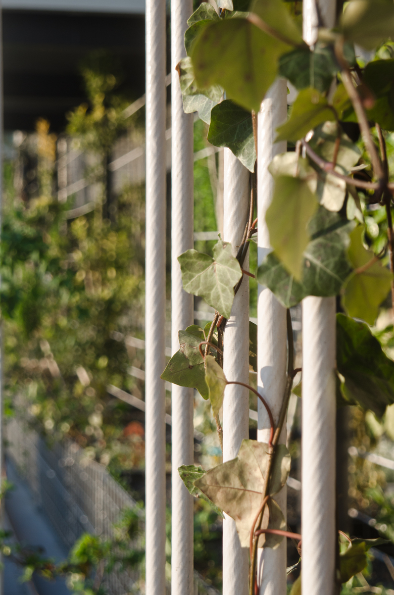 Here we have undertaken a green wall project for a newly opened multi-storey car park in the coastal area of Nagoya, which has seen an increase in development of commercial and entertainment facilities in recent years. Along the sides of the 22.59 meter tall, six-floored building, wires have been stretched for vines to climb. Trees of various sizes were placed in-between the wires to emphasize the greenery. We have tested various vine plants at the location to select the those that can withstand the harsh coastal conditions. SUS wire with white PVC coating was used as the base material for the green wall, and they are visible from the outside. By working something that are normally hidden into a part of the design, we have aimed to retain the design features even during seasons with less foliage.