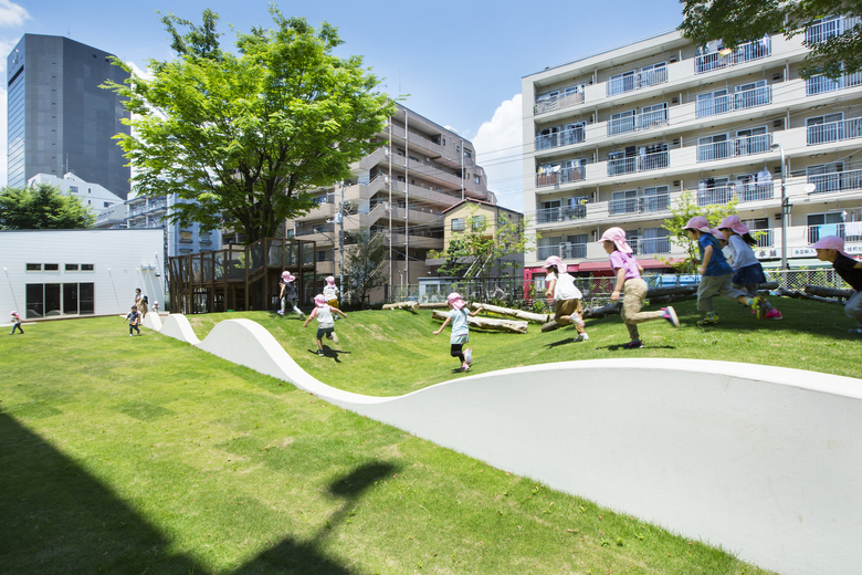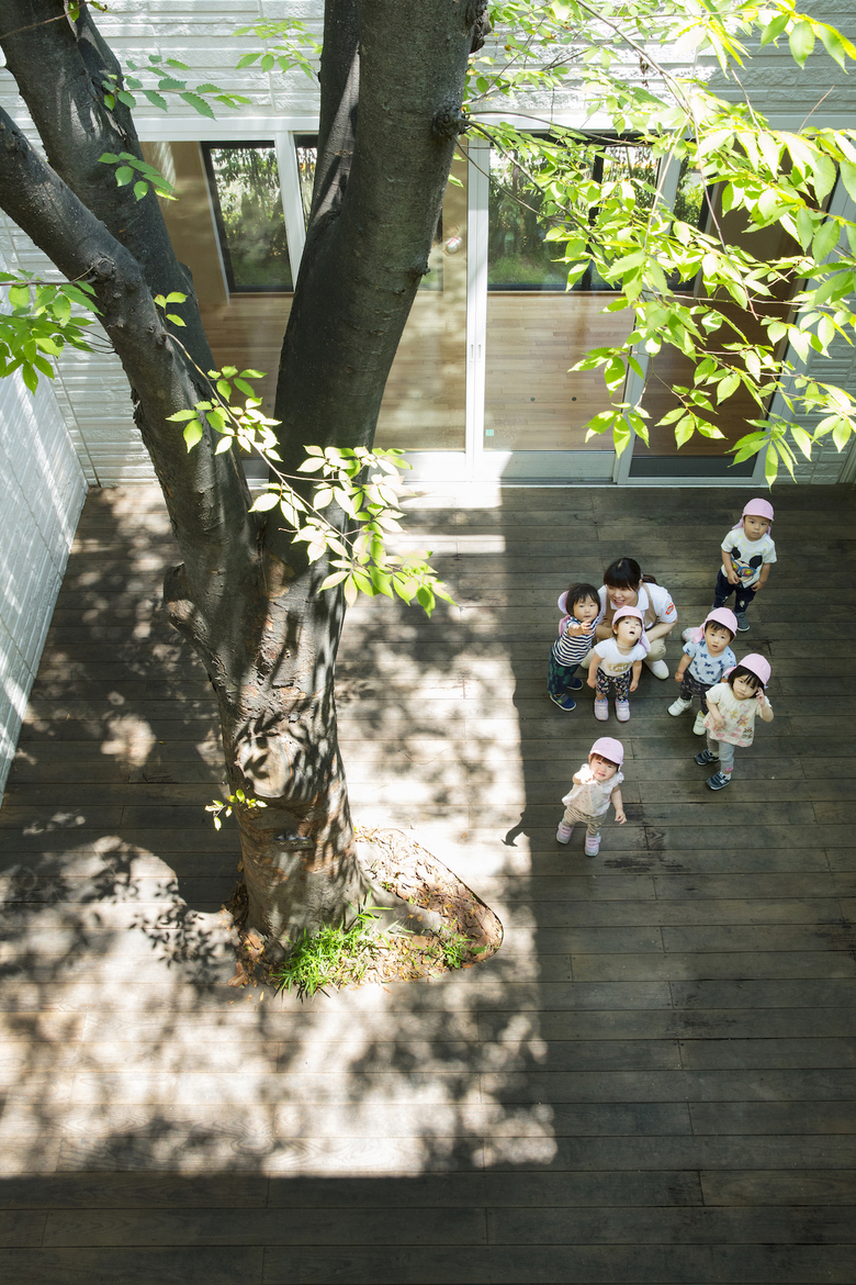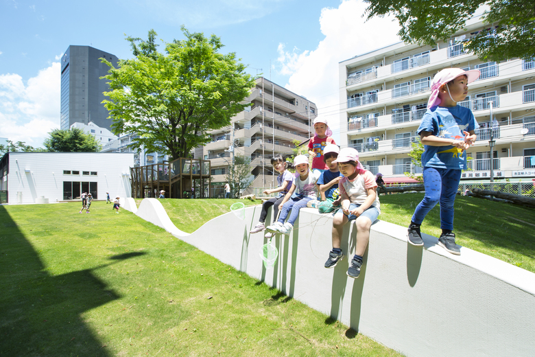 The east side with indoor and outdoor play areas are “be open” to the public with things made clearly visible from the outside. A wooden deck walkway leads out from the play room like a pier to a large Japanese zelcova tree. The tree is also surrounded by wooden decking where children can run out barefoot to what feels like a tree house. The playground is divided up dynamically with reinforced concrete retaining walls, where children can play on varying terrain such as wavy mounds. Drawing inspiration from the logs that used to float in the local log pools in the past, we placed logs on the wavy mounds like balance beams. These logs were actually cut from trees felled from the grounds.