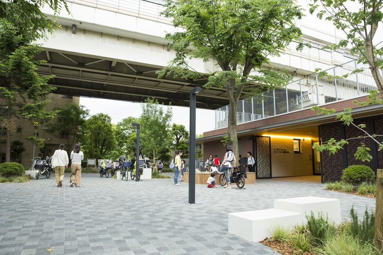 The nursery entrance is located facing the communal path that cuts through the nursery grounds. Created as a small park of its own with benches under the shade of trees, it is a place for people to “mingle.” People connected with the nursery such as the children, parents, and teachers, as well as anyone from the close community, are all welcome. The stepped benches are fun for children to hop on and off.