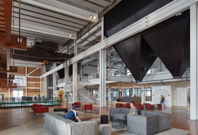 Transforming the hundred-year-old structure presented significant challenges, especially to efficient energy use. New insulation regulates heat flow in the historic portions of the building, while the polycarbonate façade of the new field house provides advanced thermal insulation and abundant, diffuse natural light throughout the day. In addition, a radiant panel and slab system harnesses energy from the Rock River for most of the Powerhouse’s heating and cooling needs, improving comfort within the building and maintaining the highest air quality, while also minimizing total energy use.