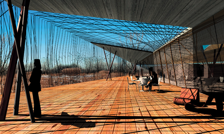 In order to educate visitors about the Calumet region's unique industrial and natural importance, this project reconceptualizes the way a building is constructed. Using the nest-making process as a model, the design for the 27,000 sf Environmental Center is composed of materials collected from things abundant, nearby, and discarded: salvaged steel from the Calumet industrial region and other remnant, recyclable materials such as slag, glass bottles, bar stock, and rebar. In highlighting these materials and employing them in new ways, the building demonstrates the sustainable principle of re-use. Other sustainable features include geothermal heat pumps, earth tubes, a biomass boiler, and water collection systems, all of which are integrated into the overall building design and become part of the educational component of the center and its site.