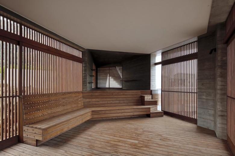 The roof slabs, which amplify the triangular shapes of the footprint, are supported by polygonal columns that vary in form throughout the home, and, in places, by bearing walls. Interior air volume requirements determined the rhythm of the slabs and the volumes of the spaces they enclose. Rooms facing the sea connect to one another, twisting to the east and west to create a sequence of spaces.