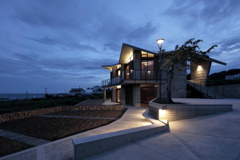 The footprint of this vacation home dances around the complex conditions of the site. Although the site is splendidly situated overlooking an ocean view to the southeast, there is an elevation gap of about 1.4 meters in the center, around an outcropping of bedrock, and an unbuildable area cutting into the property on the street side. By necessity, the detached building housing a two-car garage and guest room is situated on the east side, where the elevation gap is smallest, but the client requested that the main house weave around the difficult site conditions.