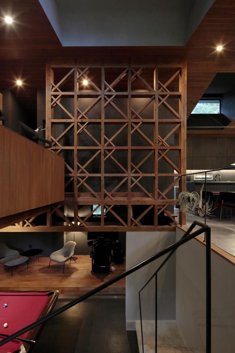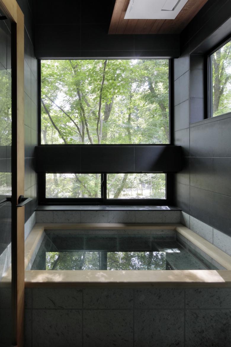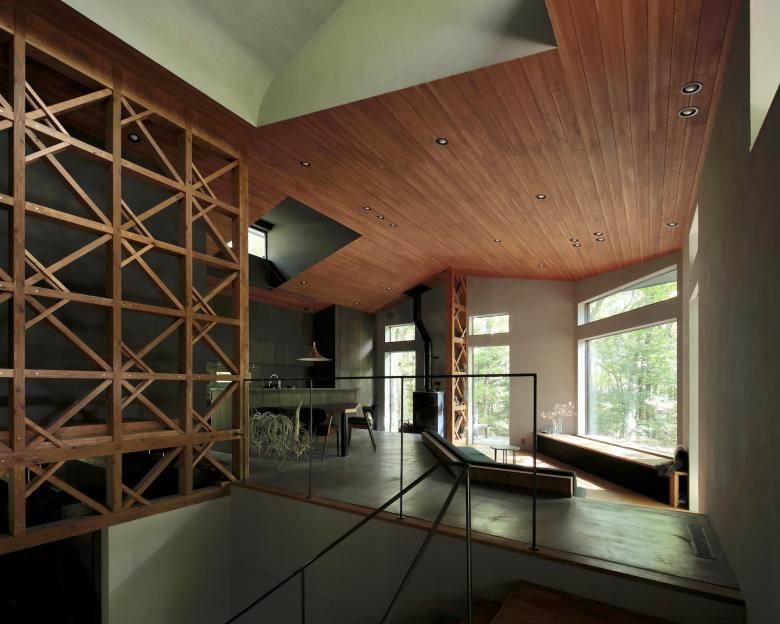 The town of Karuizawa is known for its cool and refreshing summers, but the winters can be harsh, with temperatures dropping below -10°C. Because of this, the foundations of homes here must be built below the frost depth. While parts of home foundations here are sometimes dug independently from their main structures, the structure itself, in this case, also lies below the frost depth, and this portion of the house was utilized effectively: at the request of the client, a full-size billiard table was installed in this belowground section, which was incorporated into the design of the residence as a value-adding enhancement.