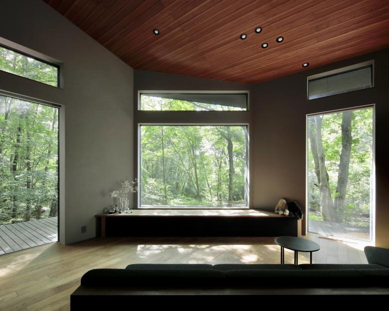 This residence was designed for a client who relocated from the city to a rural highland area with the intention to work remotely. The site is characterized by a gentle slope that runs from the west side, which faces a road, to the east before dropping sharply. A small stream flows below, forming a modest valley. As a result, there is a significant distance between the residence and the nearest house, located across the valley, and the view on this side is marked by trees that cascade down the slope in a dense, layered arrangement. To make the most of these surroundings, the southeast corner of the residence was designed to accommodate a large picture window.