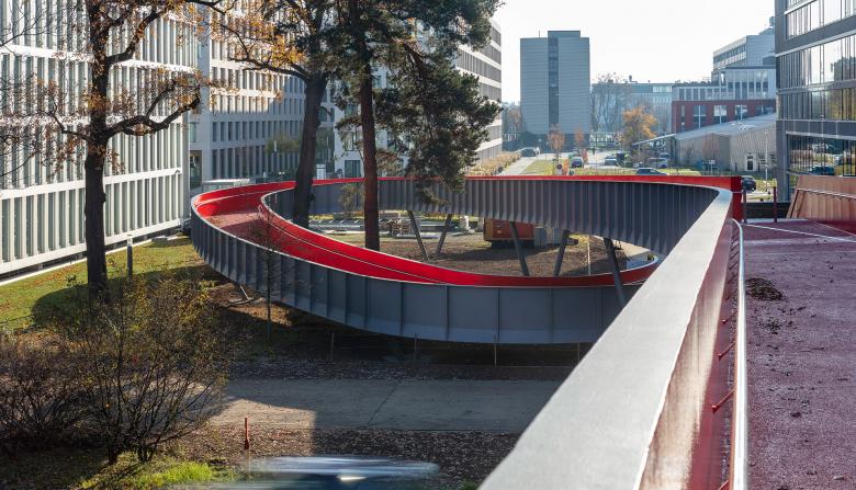 Die Fuß- und Radwegebrücke über die stark befahrene Rheinstraße in Darmstadt stellt die fuß- und radläufige Verbindung zwischen dem Hauptbahnhof und dem Technologiezentrum (TZ) Rhein-Main her. Die Gestalt der Brücke entwickelt sich aus einer Trogkonstruktion, die auf V-förmigen Doppelstützen aufliegt. Sie schwingt elegant über die Rheinstraße und schlängelt sich spielerisch mit ihren langen Rampen durch den Baumbestand. Die Steigung der beiden Rampen ist für die Nutzung durch Radfahrer wie auch für Rollstuhlfahrer ausgelegt; Fußgänger können zudem die an den Brückenenden angeordneten Treppen nutzen.
