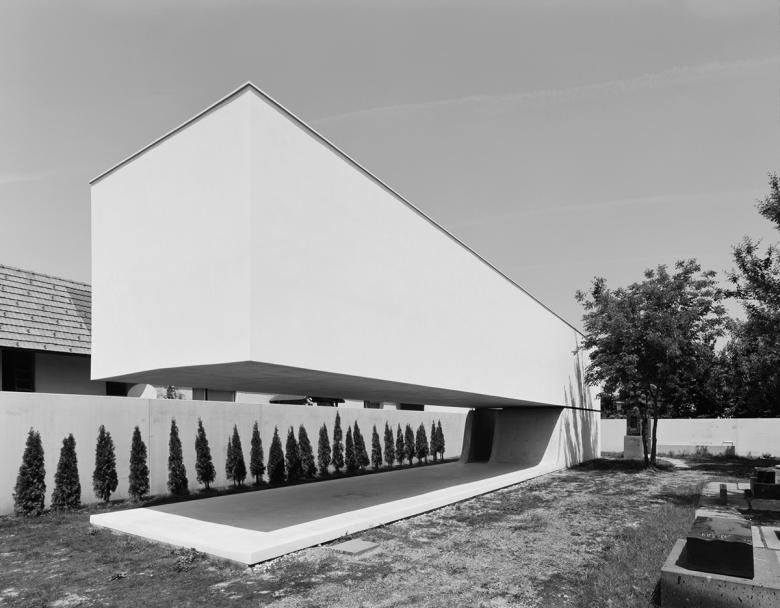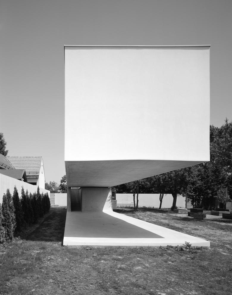 Der Bildhauer Karl Prantl hat im österreichischen Pöttsching eine Landschaft mit Skulpturen, Bäumen und Architekturen geschaffen, in die ein neues Gebäude, ein Bilderlager für die Werke seiner als Malerin arbeitenden Frau Uta Prantl, einzufügen war. Dieses Gebäude, das selber nicht Skulptur sein, aber klare Haltung zum Kontext beziehen sollte, stellt sich als Gebäudeblock dar, der über dem Erdgeschoss zu schweben scheint. »Es gibt kein Außen und kein Innen, es gibt nur einen Raum auf der Welt. Wie ein Steinbruch verweist auch das Bauwerk auf weichere oder härtere Schichten, die unterschiedlich erodiert sind.« 1)