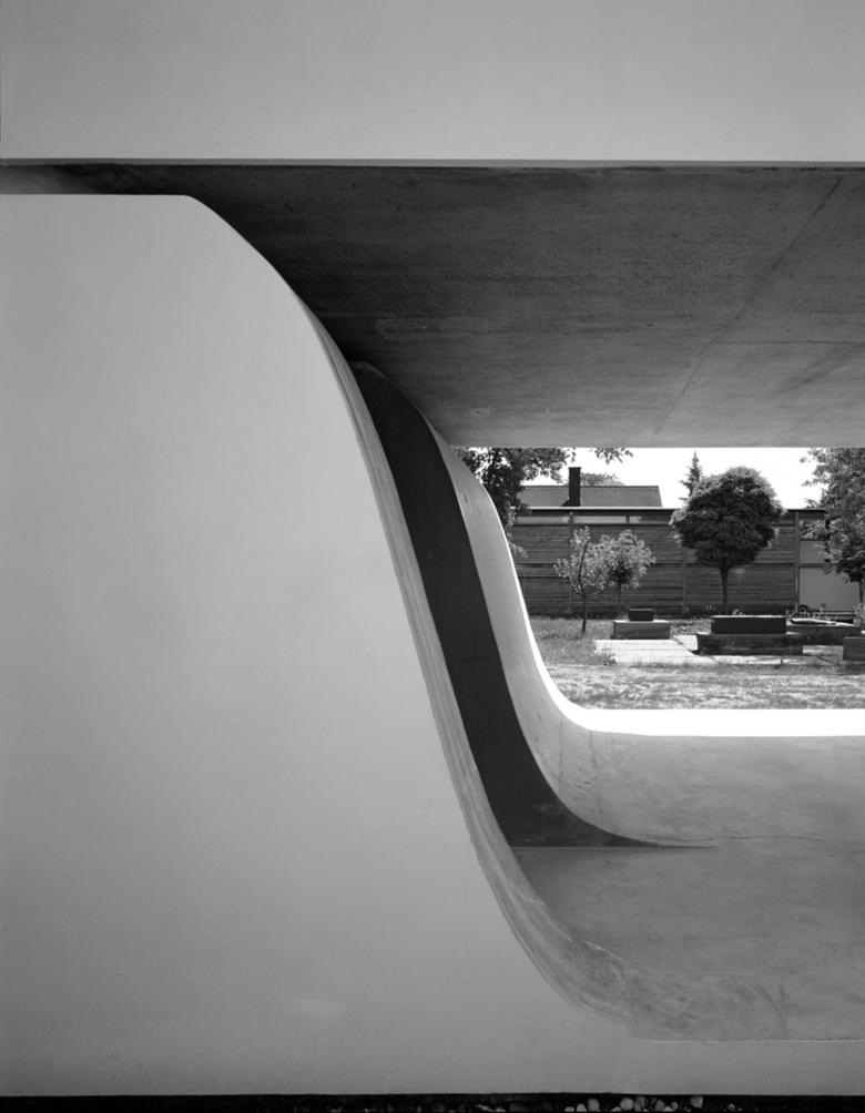 »Der Speicher ist aus mehreren Schichten gebildet, die sich erst in der Bewegung erschließen. Durch den Garten schreitet man an der schwebenden Längsflanke entlang. Die Schatten der kahlen Äste eines Baumes fallen auf die weiße Wand, Klar hebt sich über der horizontalen Linie einer tiefen Fuge der obere vom unteren Bauteil ab, was den Eindruck des Schwebens noch verstärkt [..] die Fugen mussten so tief ausgebildet sein, dass der Baukörper wie ein ausgehöhlter Stein wirkt und so auf die Skulpturen reagiert, ohne mit ihnen in Konkurrenz zu treten.« 2)