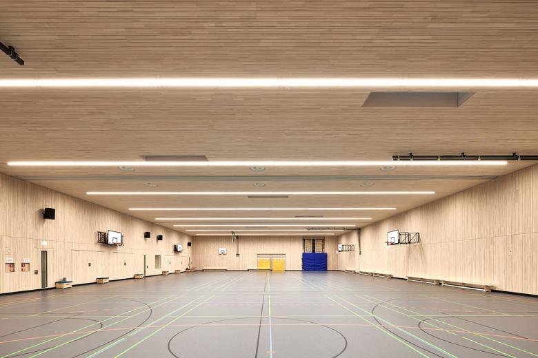 Die Dreifachsporthalle der Schule befindet sich zentral im Gebäude unter dem Pausenhof im 1. und 2. Untergeschoss. Sie ist mit einer Rippendeckenkonstruktion mit einer maximalen Spannweite von 24,3 m ausgeführt. Zur Aufnahme der Lasten aus den aufgehenden Geschossen wurden hierfür vorgespannte Stahlbetonbinder gewählt, die vor Ort auf der Bodenplatte der Sporthalle geschalt, bewehrt und betoniert wurden. Nach dem Vorspannen wurden sie mit einem Autokran eingehoben.
