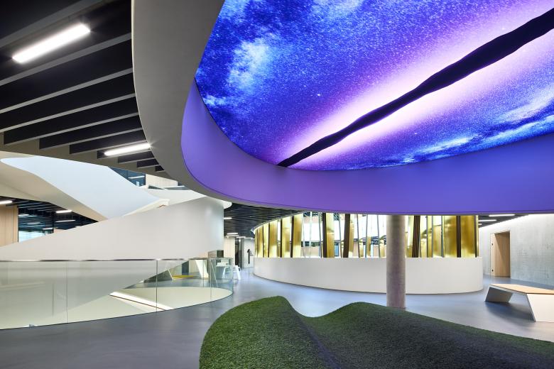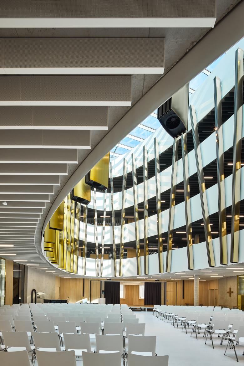 Über der Aula, die im Erdgeschoss in dem zum Keßlerplatz orientierten Gebäudebereich angeordnet ist, befindet sich ein über drei Geschosse reichendes elliptisches Atrium, das über eine großformatige Stahl-Glaskonstruktion in der Dachdecke belichtet wird.
