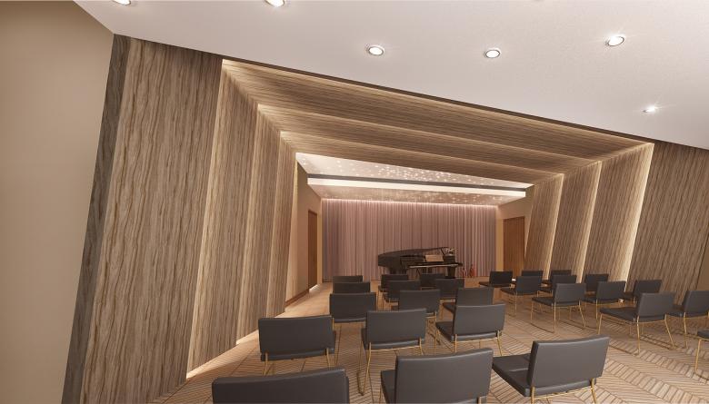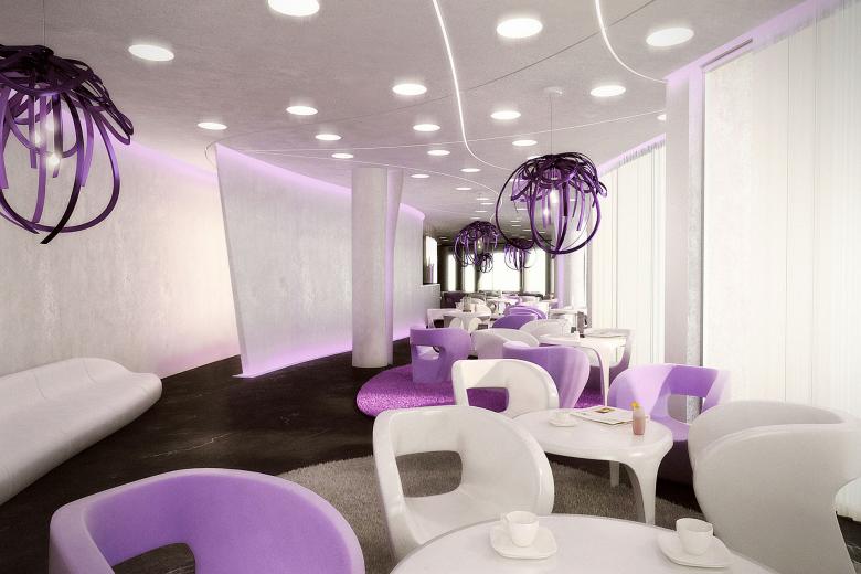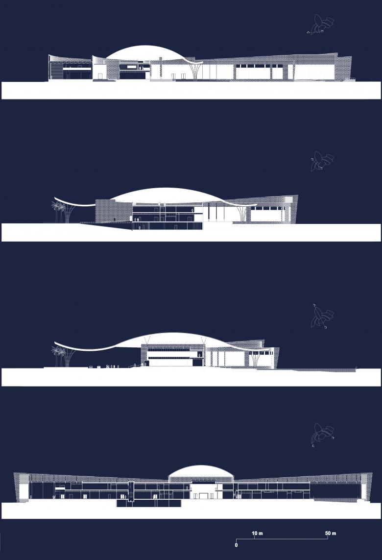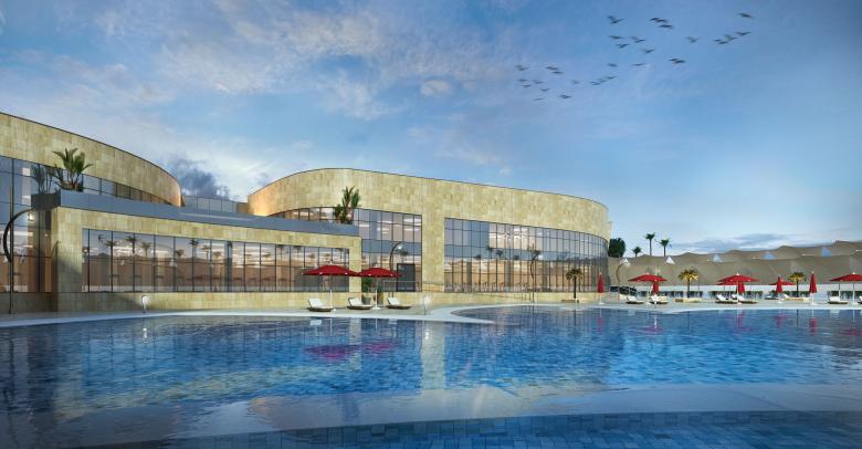 The modern and organic architecture of the club house (the 12,000 sqm main building) recalls the floral forms in plan: the client's request was to have a unique building, highly iconic and with sinuous and non-rigid shapes. The sinuous forms have generated fluid and unusual spaces that make this architecture highly characterizing. The plant embraces a semi-covered central space is called Festival Space. In this space there are the outdoor swimming pool and the solarium area overlooking the park and the beach.