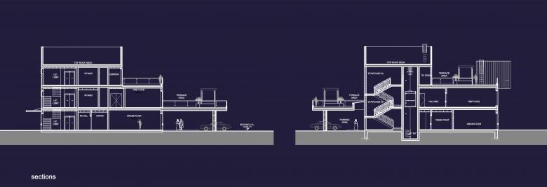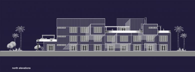 On the ground floor, there are spaces for shops and possibly small cafeterias on the street. On the upper floors, there are shops and businesses with internal windows and office spaces. On the first and second floors, there are terraces with pergolas to be able to go out and have an outlet to the outside. These terraces offer the spectacular view of the nearby desert dunes. The roof level is occupied by systems shielded by parapets up to almost 3 meters high. On each floor there are services and bathrooms.