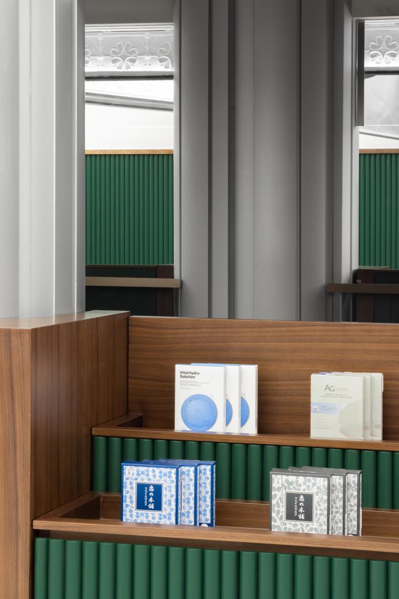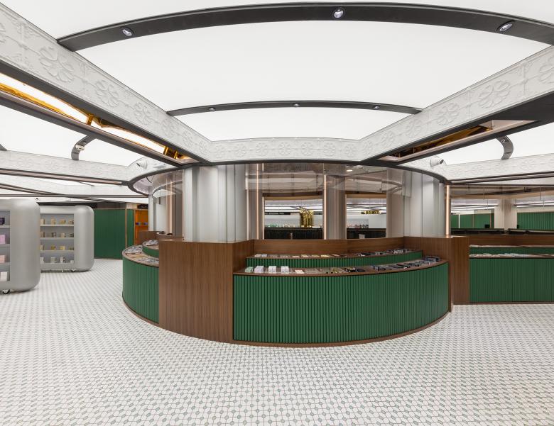The creative combination of diverse elements, including green leather edged by wooden lines, wooden spiral staircase and trays, reflective brass that glitters under the illuminated stretch ceiling, and mosaic tile floorings, generate a retro atmosphere that echoes old exotic buildings in Shanghai. Meanwhile, modern materials are also incorporated into the space. The contrast of different material textures produces a unique visual identity for the store. Just like the city of Shanghai, it blends both classical and future vibes.