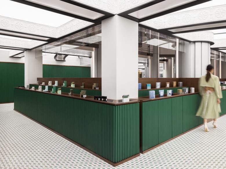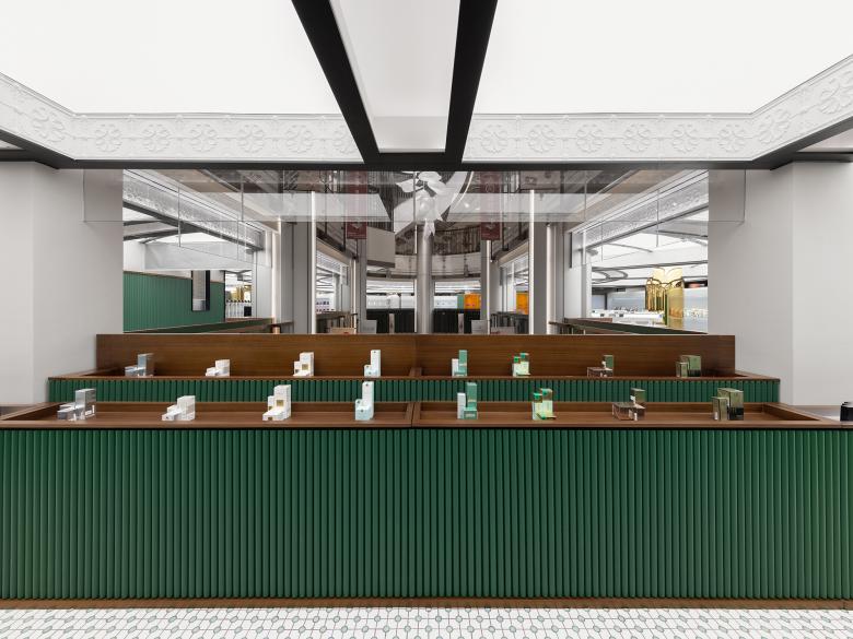 The bespoke embossed gypsum reveals a distinctive Shanghai style. The green and white ceramic tile floor featuring a matrix pattern is reflected on the mirrored stands, showcasing Shanghai style in a more three-dimensional manner and helping balance the visual composition.