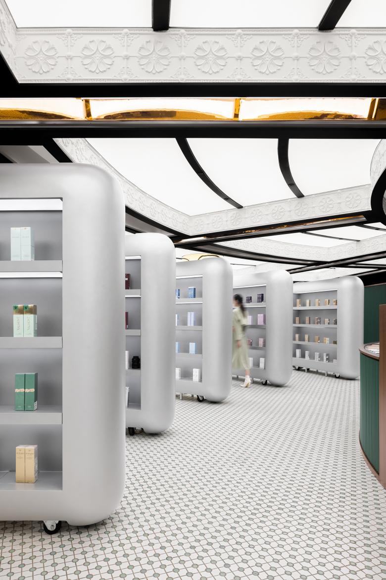 The spatial languages narrate the integration of Eastern and Western cultures. Shanghai-style retro atmosphere and sci-fi absurdity contrast and harmonize with each other through the interaction of art and architecture, giving new interpretation of "Eclecticism" through this cosmetics store based in a century-old Shanghai building.