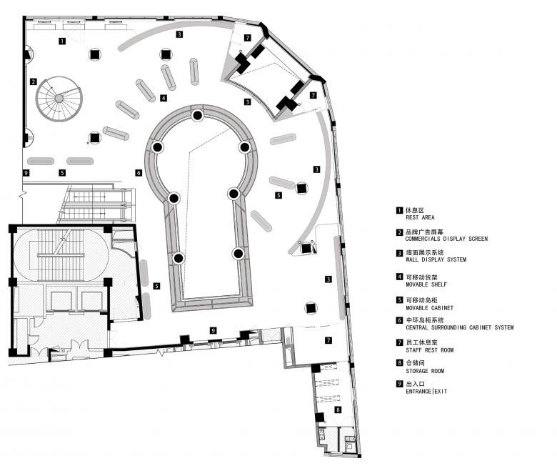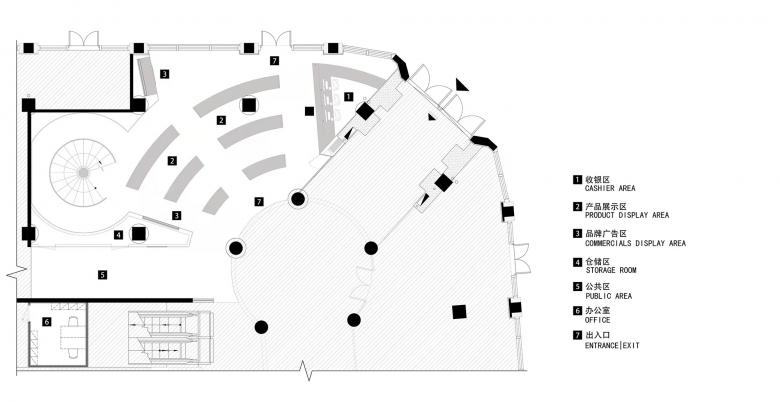 The movable cabinets and circular ceiling structures in the store echo moving aircrafts and their orbits respectively. The tall silver round-edged cabinets on 2F are filled with a variety of cosmetics, facing the central point along radial lines. With wheels at the bottom, those cabinets are movable at any time. In addition, the hidden plugs can easily connect with flat sockets on the floor, to satisfy the cabinets’ lighting demands. Cabinets composed of structures at staggering heights are combined to form a circle, to break the limited depth of this circular space. Beside the windows are high circular cabinets, which enclose the entire space and incorporate the original public area into the store.