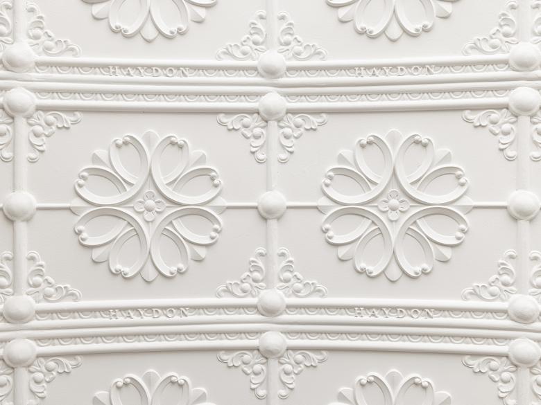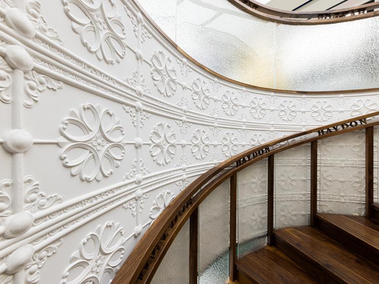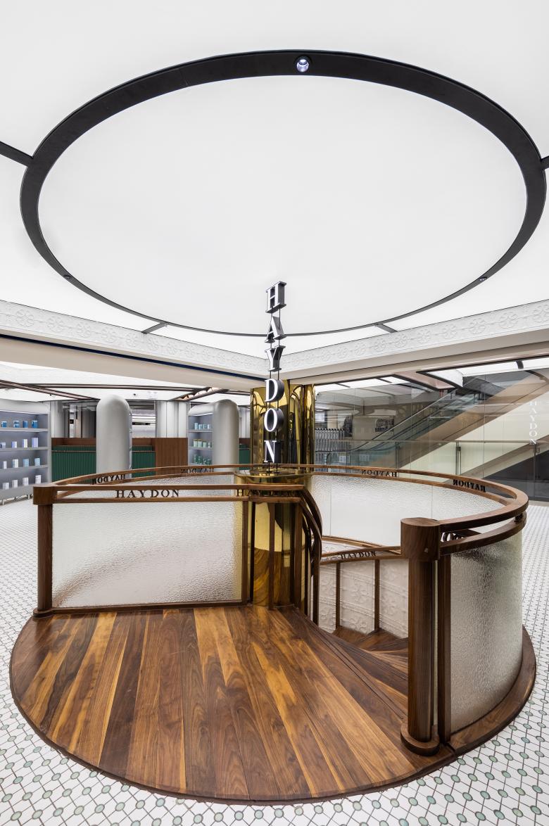 The hollow-out wooden handrail engraved with the brand's logo, the crack-pattern glass and the bespoke carved gypsum are reminiscent of past glorious days. The brand's name HAYDON is presented in the form of wooden carvings or by arranging the characters vertically. The customized white gypsum reliefs and storytelling glass partitions enclose a staircase space that gives a sense of detachment from the outside.