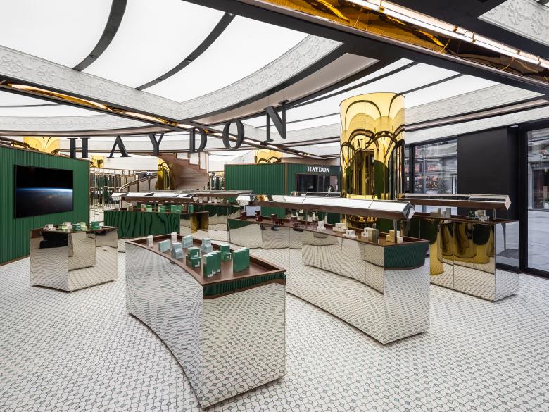 Materials that evoke past memories along with abundant lines help enrich visual layering, break monotony and strengthen the sense of depth of the space. With a limited scale, those elements create infinite fun in the space. HAYDON's logo, outlined by dark tone, is erected at the center of the staircase area on 2F. The brand logo installation slowly revolves around the classical golden column, showing the contrast of retro style and sci-fi and giving a humorous feeling at glance.