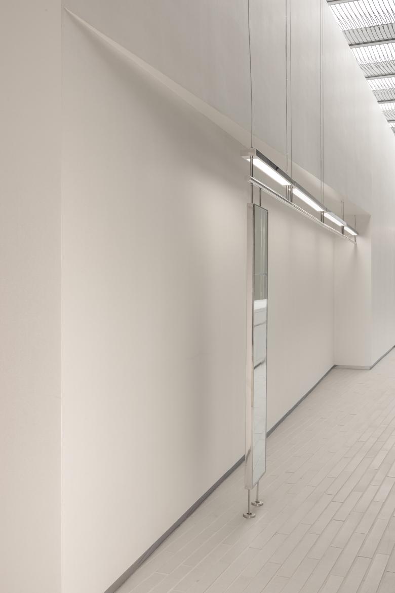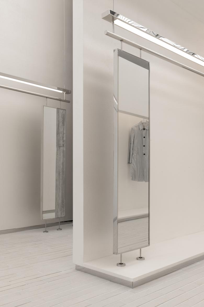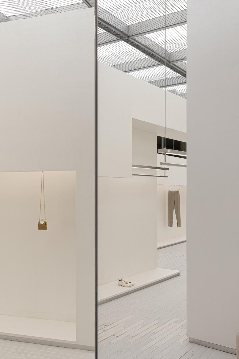 The clothes rails, lamp boards and mirrors are suspended or floating in the air. All de-tails reveal a coherent logic, giving the space an exquisite touch and a sense of layering.