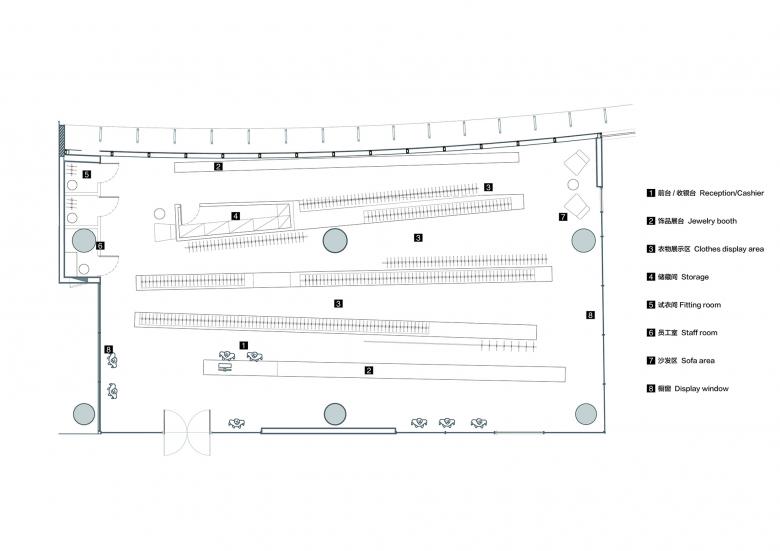 The entrance area consists of a front desk and an area for clothes packaging, so that customers can be provided with timely services as entering and leaving the store.
